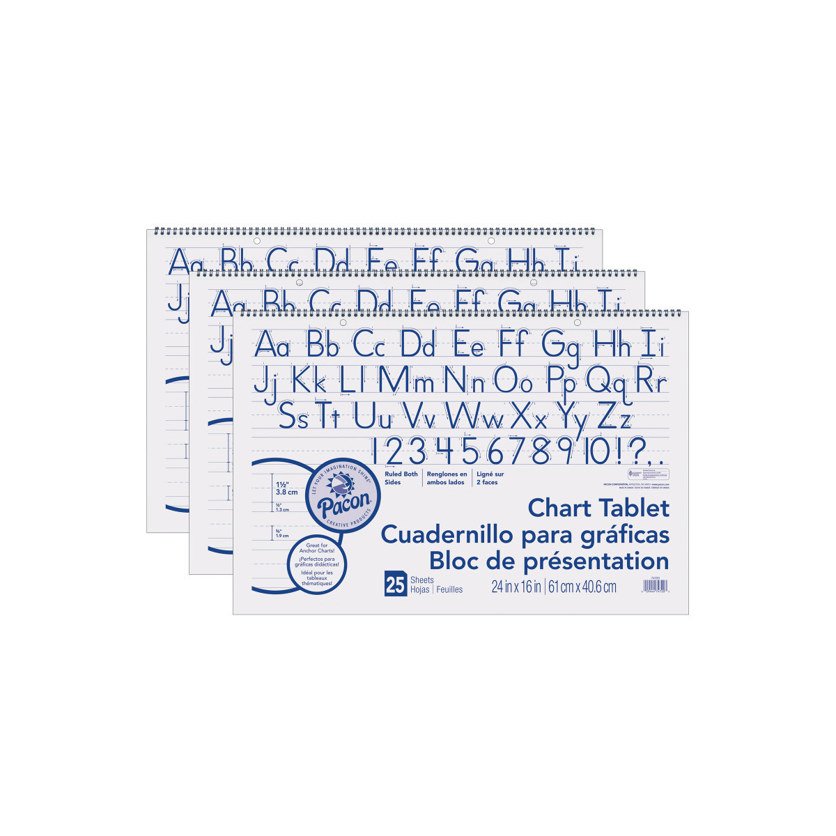 This Chart Tablet features White sulphite bond paper that is spiral bound to stiff covers with a Manuscript alphabet printed inside. It is 2-hole punched for easy hanging. Paper is ruled on both sides, and works well for classroom anchor charts, posters and other teaching aids. Ruling is 1.5" with 0.75" broken midline and 0.5" skip space. Measures 24" x 16". Each tablet includes 25 sheets. Sold as a pack of 3 tablets.