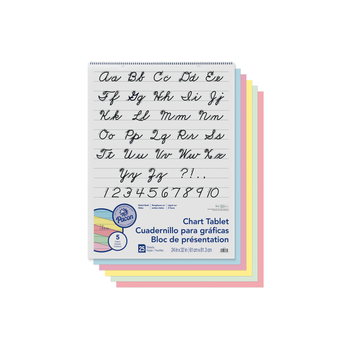 Traditional chart tablets made with pastel colored bond paper. Each tablet contains assorted colors: Yellow, Pink, Salmon, Blue and Green. Sheets 1" ruled the short way, spiral bound and 2-hole punched. Inside front cover features a Cursive alphabet. Recycled and Recyclable. Measures 24" x 32". Includes 25 sheets.