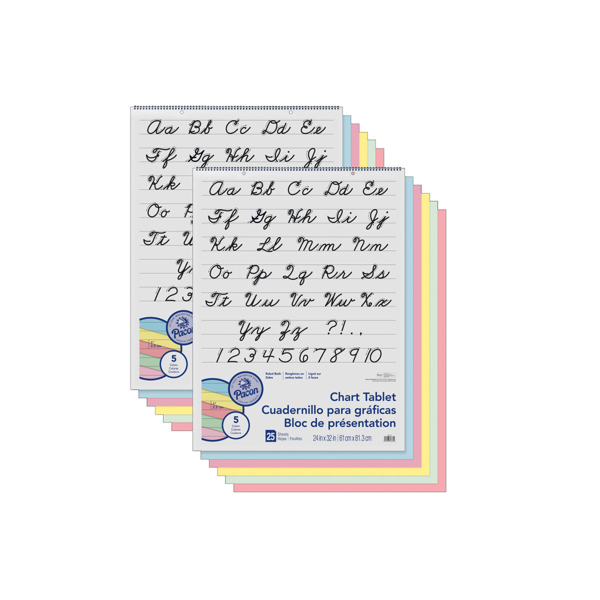 Traditional chart tablets made with pastel colored bond paper. Each tablet contains assorted colors: Yellow, Pink, Salmon, Blue and Green. Sheets 1" ruled the short way, spiral bound and 2-hole punched. Inside front cover features a Cursive alphabet. Recycled and Recyclable. Measures 24" x 32". Each tablet includes 25 sheets. Sold as a pack of 2 tablets.