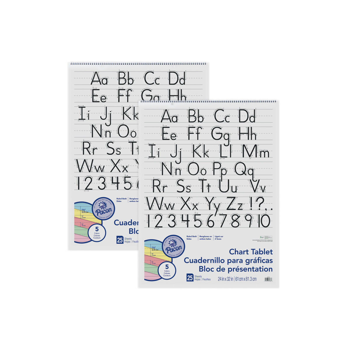 Traditional chart tablets made with pastel colored bond paper. Each tablet contains assorted colors: Yellow, Pink, Salmon, Blue and Green. Sheets 1-1/2" ruled the short way, spiral bound and 2-hole punched. Includes a 3/4" dotted midline and 1/2" skip space. Recycled and Recyclable. Measures 24" x 32". Each tablet includes 25 sheets. Sold as a pack of 2 tablets.