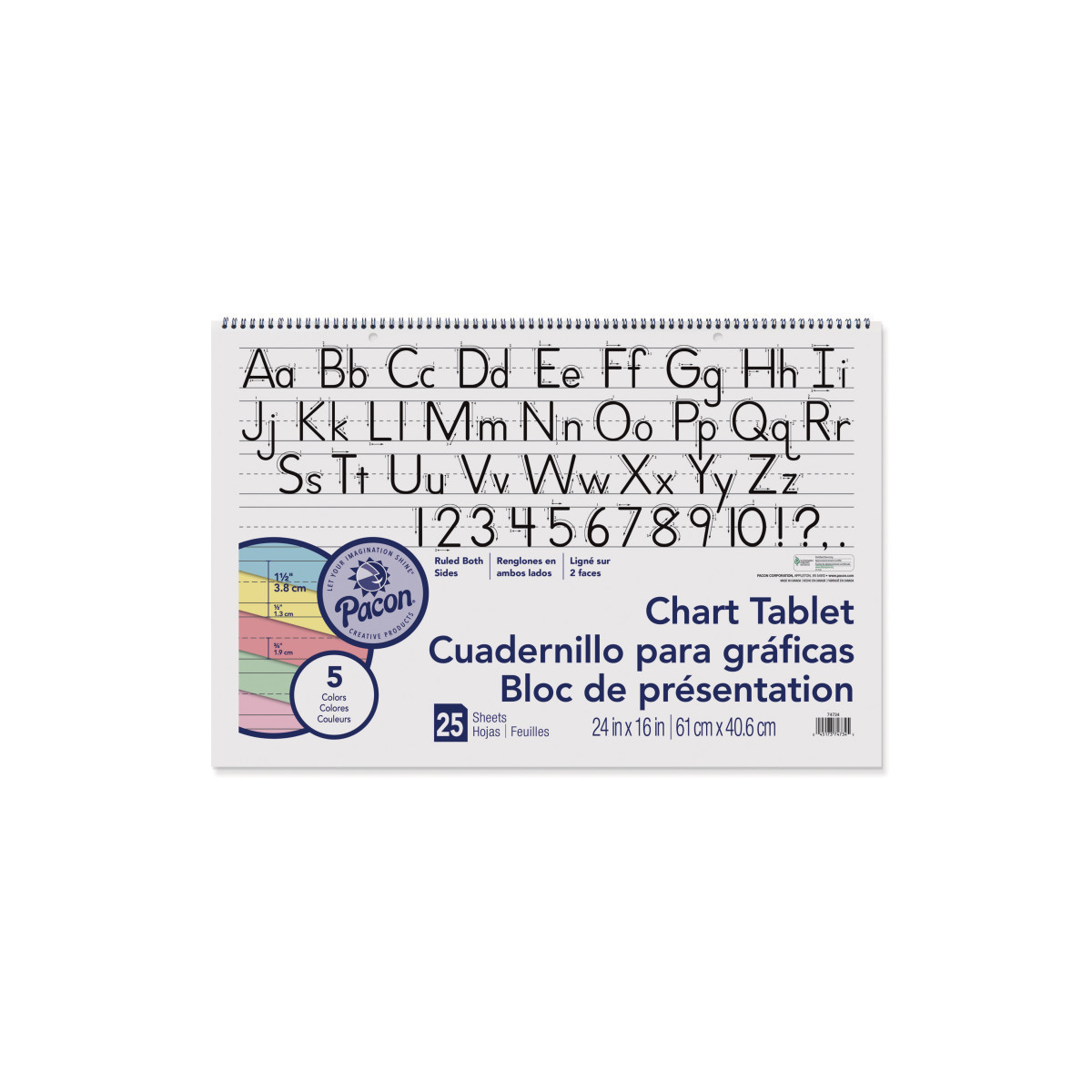Traditional chart tablets made with pastel colored bond paper. Each tablet contains assorted colors: Yellow, Pink, Salmon, Blue and Green. Sheets 1-1/2" ruled the long way, spiral bound and 2-hole punched. Includes a 3/4" dotted midline and 1/2" skip space. Recycled and Recyclable. Measures 24" x 16". Includes 25 sheets.