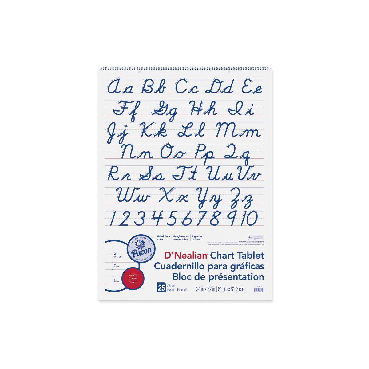This Chart Tablet is 2" ruled on both sides with solid blue headlines, dotted blue midlines and solid red baselines. The outside cover shows the cursive alphabet and numerals, with directional arrows for classroom demonstration. The inside cover shows the alphabet and numerals for modeling when writing in the tablet. White sulphite bond paper sheets are spiral bound and 2-hole punched. Ruled the short way. Recyclable. Measures 24" x 32". Includes 25 sheets.