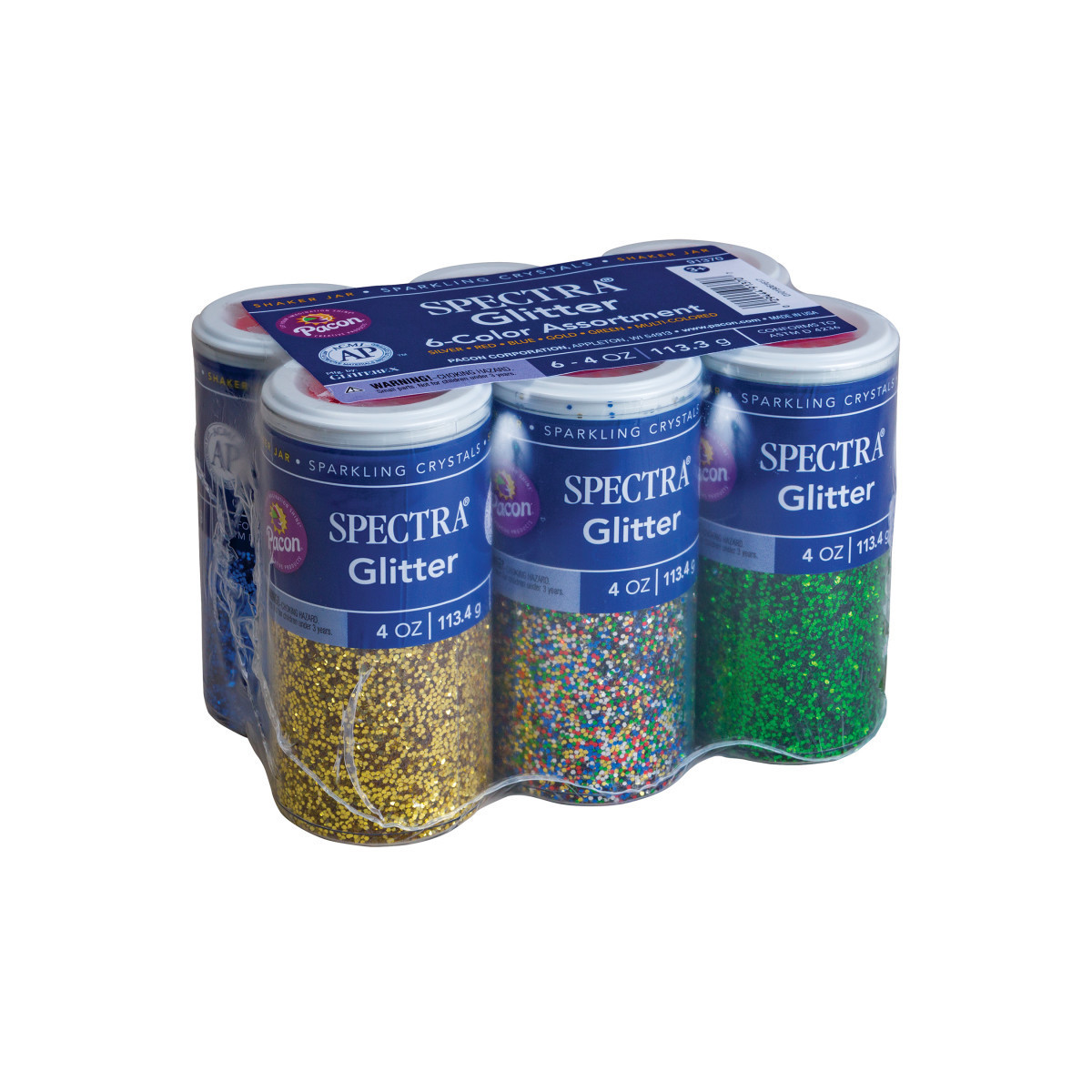 By popular demand, Sparkling Crystals 4 oz. glitter assortment with six of the most popular colors. Each color is packaged in a convenient plastic dispensing jar with a variety of slot openings making it easy to use without a lot of mess. Colors include: Red, Green, Blue, Multi-Color, Gold and Silver. Non-Toxic and conforms to ASTM D-4236.