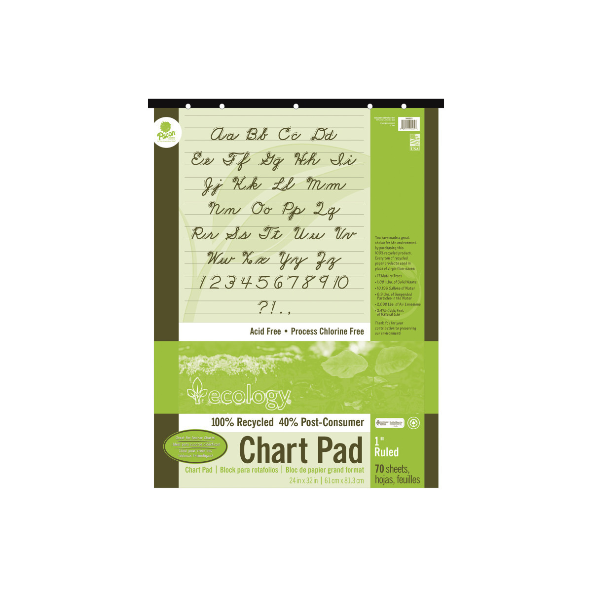 This pad contains 100% recycled content with 40% post-consumer fiber. Padded and taped to a heavy chipboard back. Each pad is 5-hole punched to fit standard Chart Stands and Easels. Measures 24"W x 32"H and is ruled the short way. Works great for classroom anchor charts. Recycled and recyclable. 70 Sheets.