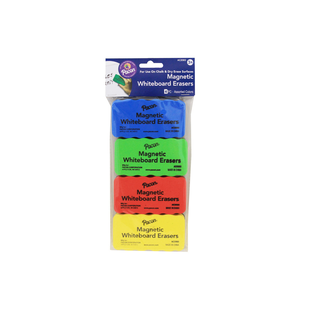 Soft, durable foam erasers have built-in finger grips. Works on both chalkboards and whiteboards. The attached magnet allows convenient storage right on your magnetic whiteboard. Includes 4 erasers in assorted colors: Blue, Red, Yellow and Green. Each eraser is 2.25" x 4.25".