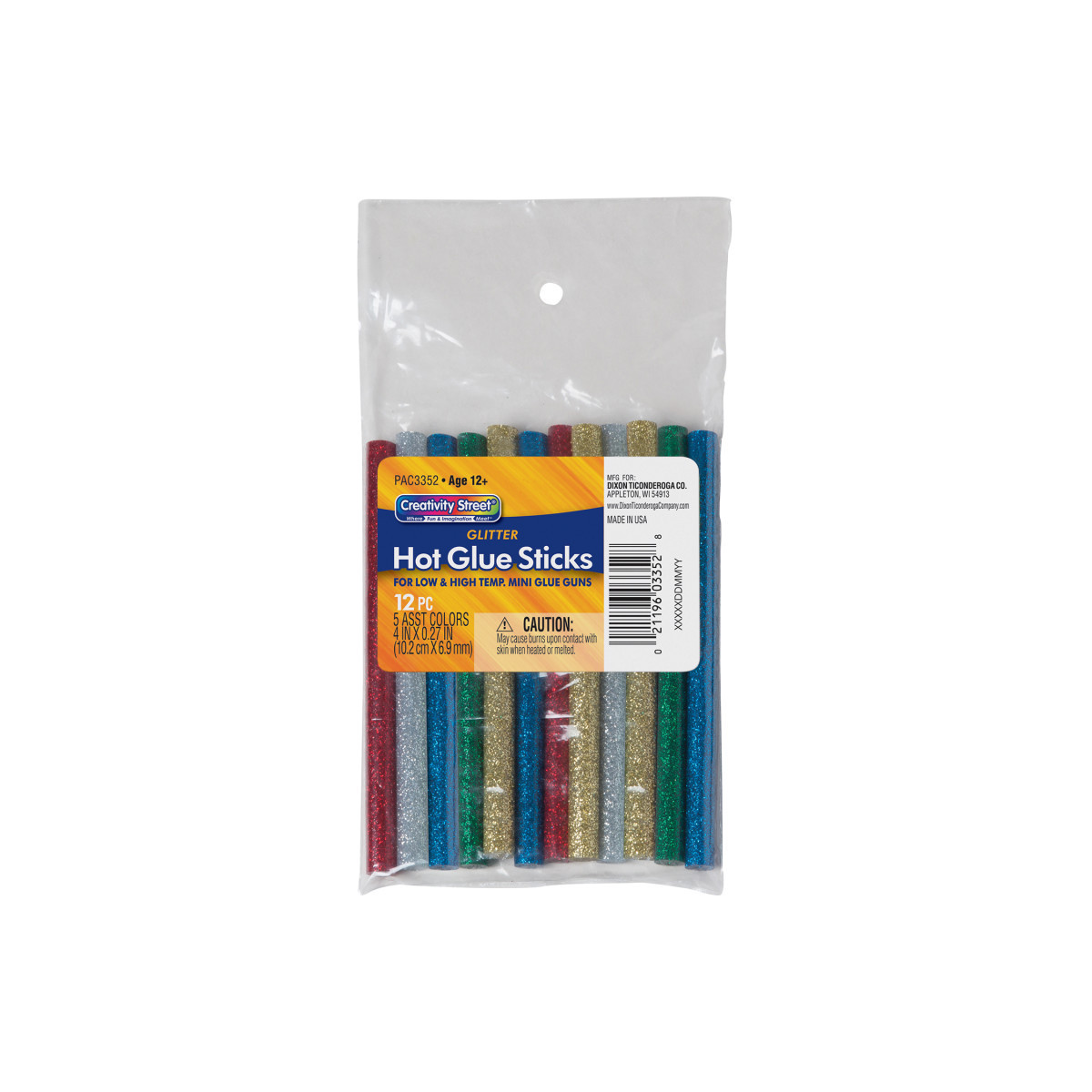 These glitter glue sticks are dual temperature and can be used in all standard hot and low temp glue guns. The glitter adds a touch of sparkle to craft projects. Glue Sticks are 4" x 0.3125". Includes 12 sticks in 6 assorted colors: Blue, Red, White, Silver, Green and Gold.