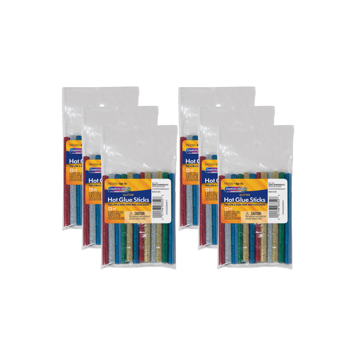 These glitter glue sticks are dual temperature and can be used in all standard hot and low temp glue guns. The glitter adds a touch of sparkle to craft projects. Glue Sticks are 4" x 0.3125". Each pack includes 12 sticks in 6 assorted colors: Blue, Red, White, Silver, Green and Gold. Sold as 6 packs or a total of 72 glitter glue sticks.