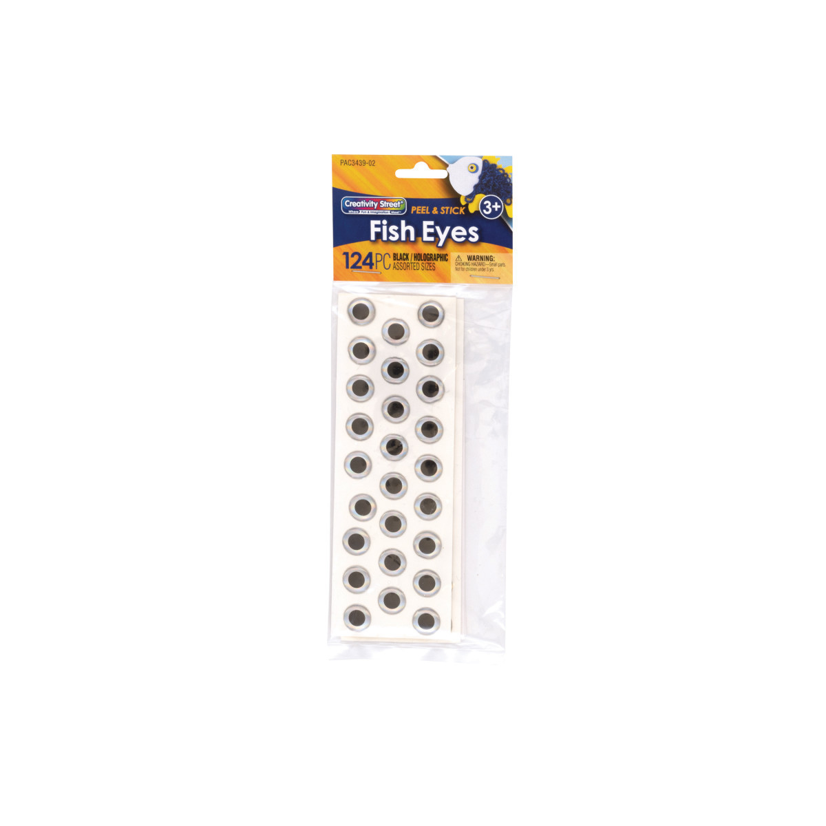 Creativity Street® Fish Eyes are black with a clear background to reflect light and give a holographic illusion of movement. Convenient, self-adhesive fish eye pack contains 72 small size eyes measuring 6 mm along with 52 large size eyes measuring 12 mm and is sold as 124 eyes per pack. Kids will love using these self-adhesive fish eyes when making paper bag puppets and other arts and crafts projects! Perfect for bringing a picture or painting to life!