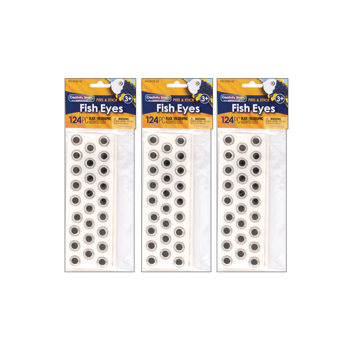 Creativity Street® Fish Eyes are black with a clear background to reflect light and give a holographic illusion of movement. Convenient, self-adhesive fish eye pack contains 72 small size eyes measuring 6 mm along with 52 large size eyes measuring 12 mm and is sold as 124 eyes per pack. Kids will love using these self-adhesive fish eyes when making paper bag puppets and other arts and crafts projects! Perfect for bringing a picture or painting to life! Sold as 3 packs for a total of 372 fish eyes.