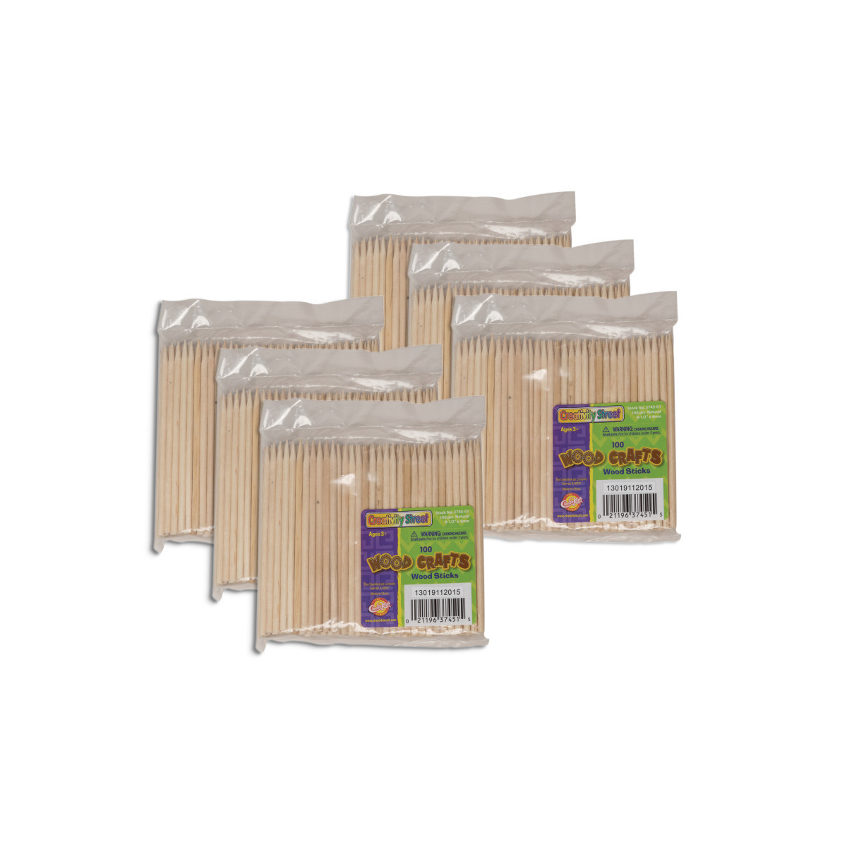 Natural Wood Sticks are round with a point on one end. These sticks can be used in a variety of arts and crafts projects, and are also the perfect stick for scratching artwork on our Now You See It!® Art Papers. Sticks measure 4.5". Each pack includes 100 natural color sticks. Sold as 6 packs for a total of 600 sticks.