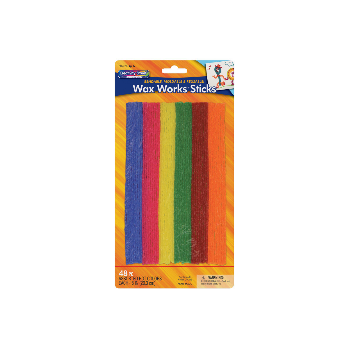 Thin strips of wax are 8" long, approximately 1/4 cm in diameter, and have a fiber strand through the middle. Bend, mold, and shape these colorful sticks to create 3D figures, shapes, structures and more! Unique wax strips are reusable, and keep kids engaged. Each pack includes 48 pieces.