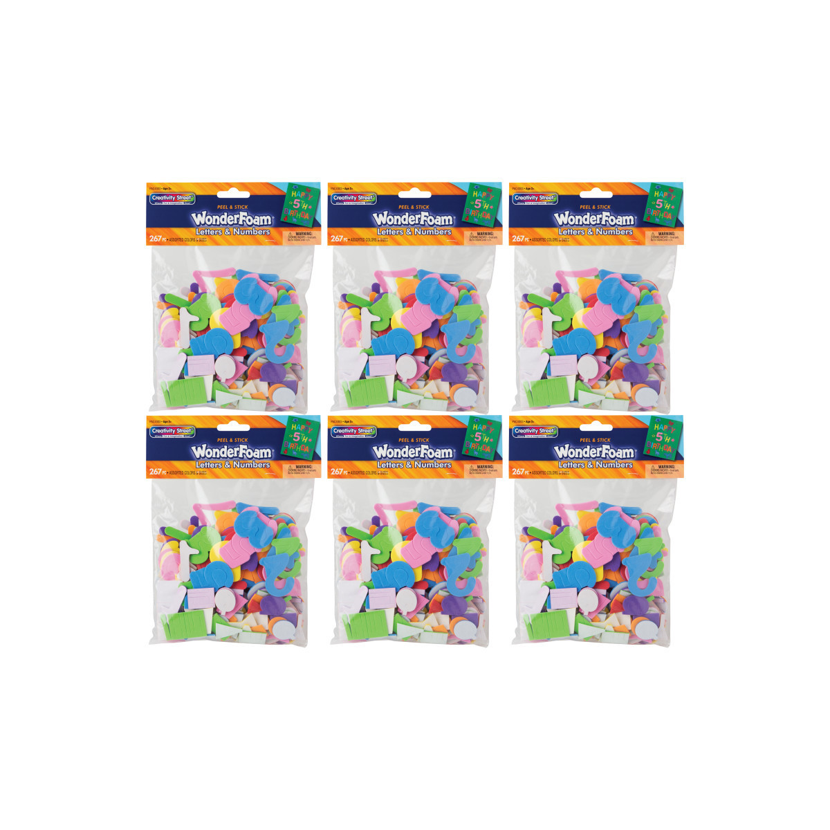 Creativity Street® WonderFoam® Peel & Stick Letters & Numbers are a fun and exciting craft addition for any project! With a variety of letters and numbers in easily manipulated foam that's both durable and lightweight, there's no crafting project that you can't accomplish. Thick enough for small hands to grab easily, these letters and numbers are a great learning tool! Add emphasis to school projects, greeting cards and crafts! Each pack includes seven assorted colors in Red, Yellow, Blue, Orange, Green, Purple and Pink and is broken out as follows: (10) sets of letters A, E, I, O, U, and (7) sets of remaining 21 letters and (7) sets of 10 numbers in 0-9. Sold as 6 packs for a total of 1602 pieces.