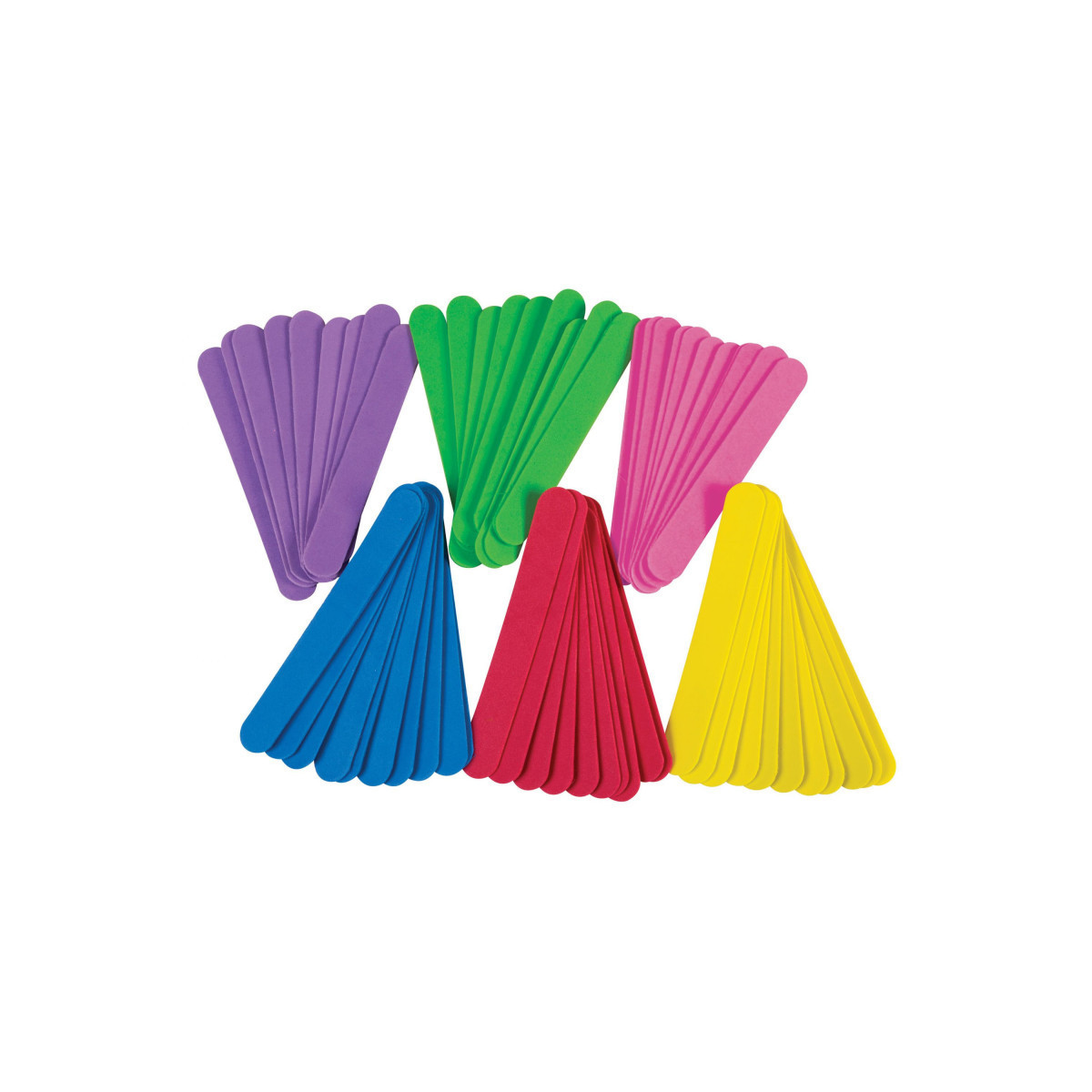 Brightly colored foam craft sticks are a unique way to create a variety of arts and crafts projects. These flexible Jumbo Craft Sticks are easy to cut and glue, and can be used for modeling, jewelry and much more! Each stick measures 6" long x .75" wide. Assorted colors include: Purple, Green, Orange, Blue, Red and Yellow. Each pack includes 100 foam craft sticks.