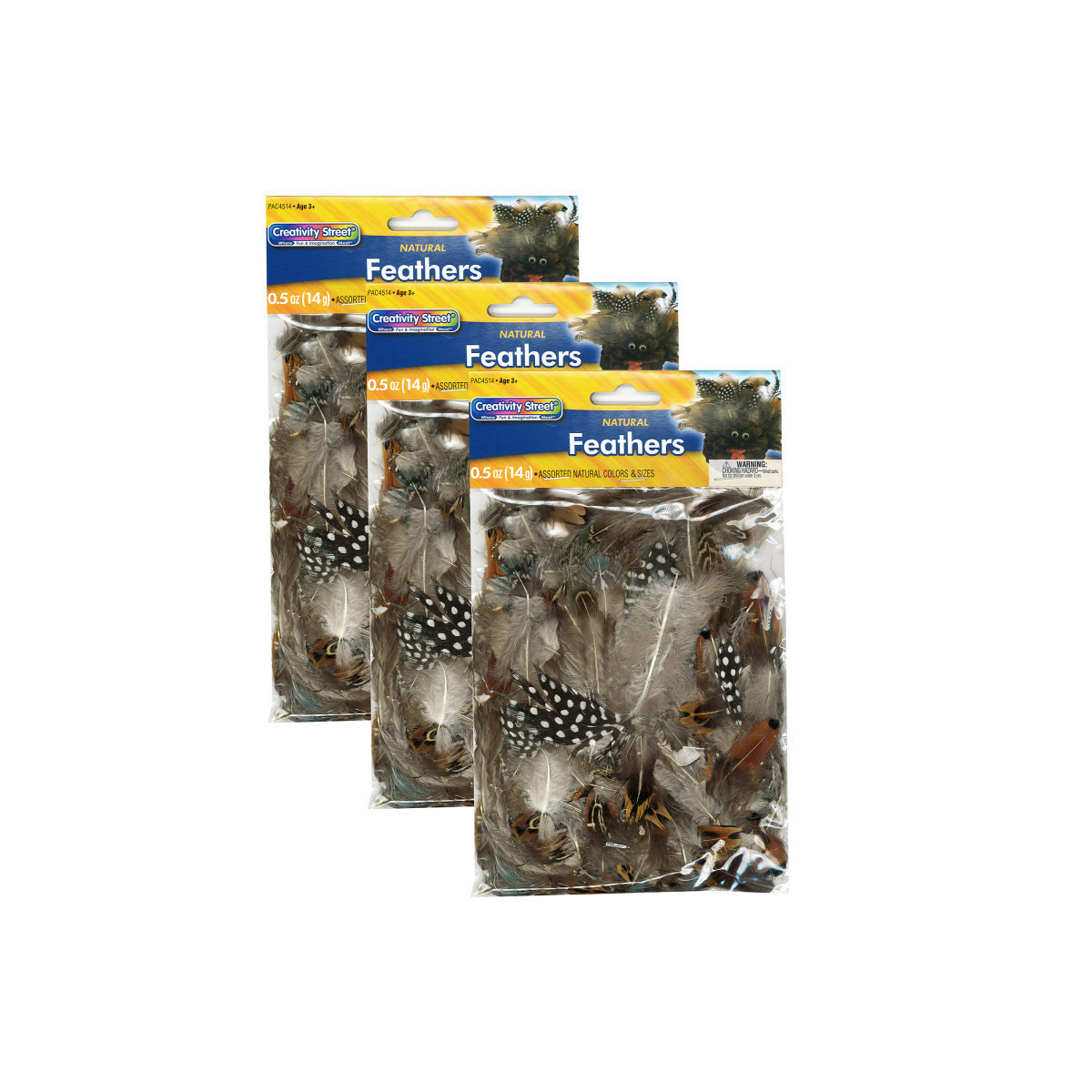 Select, natural feathers in assorted sizes, shapes and natural colors, no dyes. Each pack includes 1/2 ounces. Sold as 3 packs.
