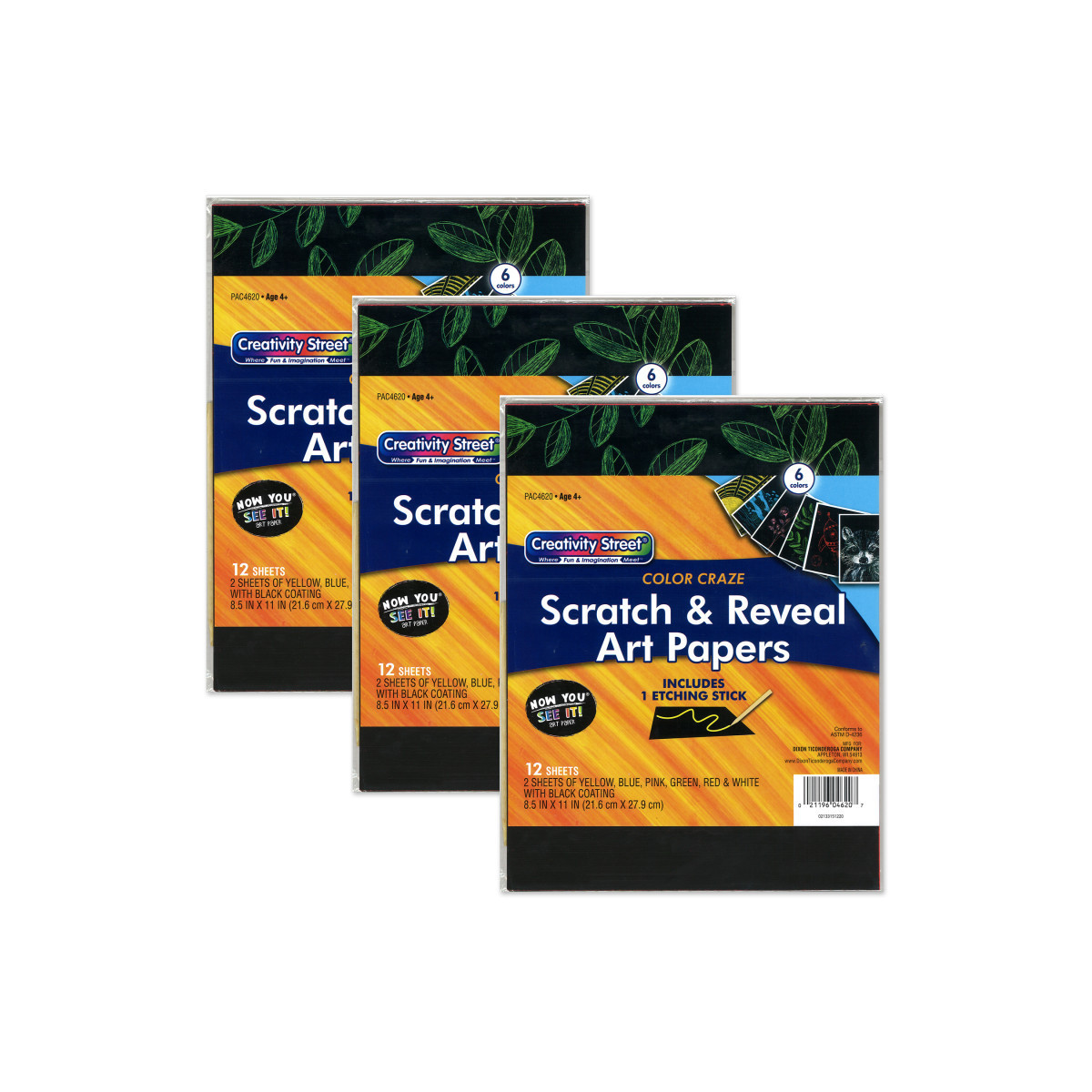 Now You See It!® Art Papers are a fun art project kids of all ages will enjoy. Use the included etching stick to reveal the color underneath. Each package also includes illustration and design suggestions. Includes an assortment of solid color: Blue, red, green, yellow, white, and pink with a black coating. Sheets measure 8.5" x 11". Each pack includes 12 sheets, etching stick, and illustration and design suggestions. Sold as 3 packs for a total of 36 sheets.