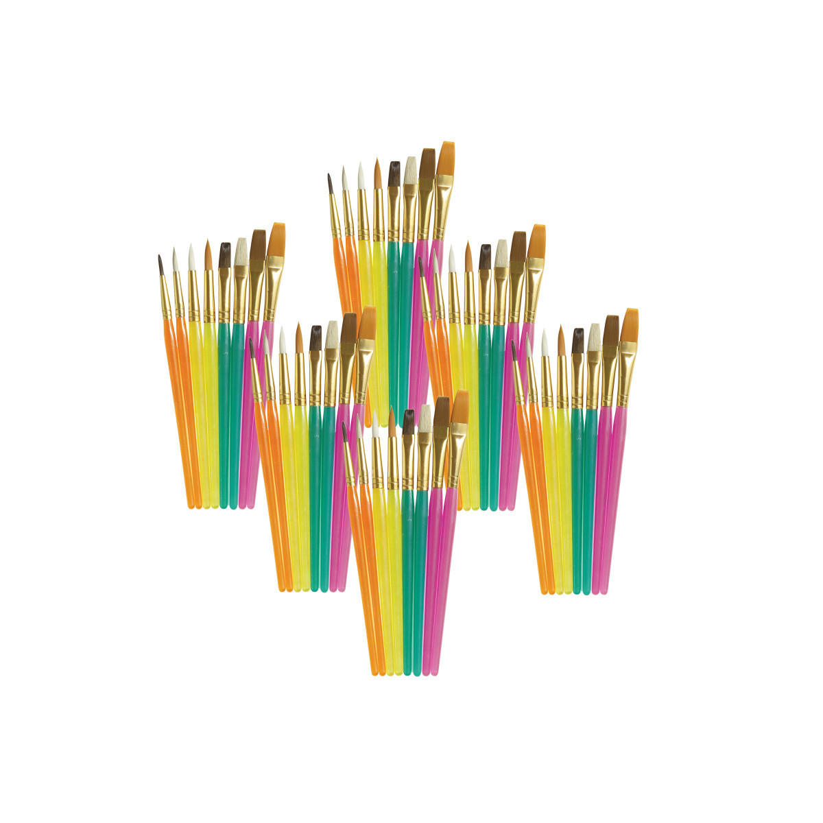 Each pack contains eight different brushes with brightly colored, translucent plastic handles that can be used with watercolor, oil, tempera and acrylic paints. The round brushes are great for details and the flat brushes are good for large areas and edging for fine lines. Sold as 6 packs for a total of 48 brushes.