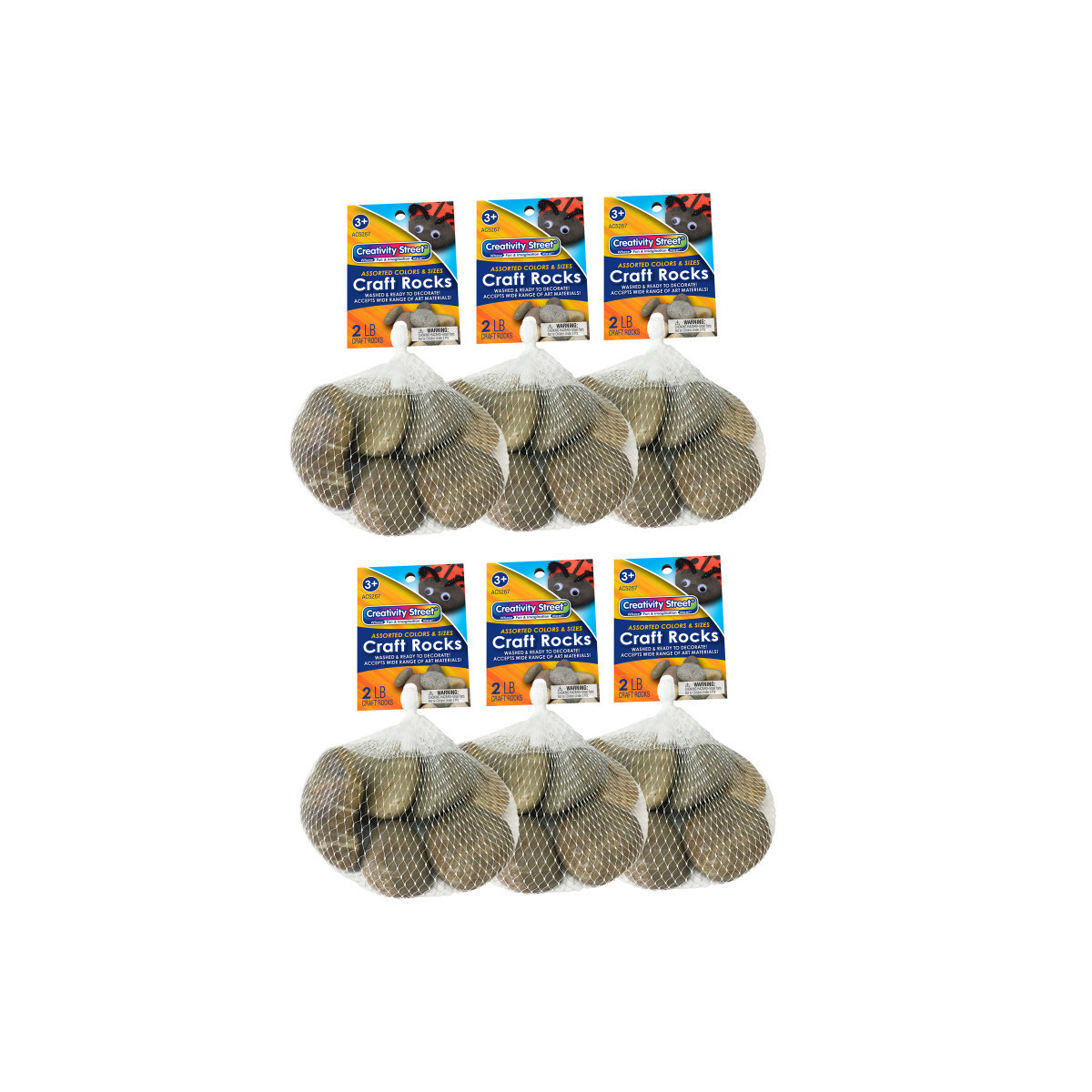 Join the rock painting craze with our Creativity Street® Craft Rocks!! These 100% natural, unwaxed 2-lb. bag of washed river rocks are ready to accept a wide range of art materials. Each mesh sack is by weight and contains rocks that vary in sizes, shapes and quantities, but most come with approximately 10 rocks. Embellish your craft rocks with our many other fine Creativity Street® products, such as Tempera Paint Sticks, Tempera Cakes, Oil Pastels, Watercolor Paint, Wiggle Eyes, Feathers, Chenille Stems, Poms, Confetti, Glitter Glue, Hot Glue and Tacky Glue! Children can learn their alphabet, colors, math equations, emotions and more through painted rocks. Create scavenger hunts that foster empowerment and engagement. Create your own board games like tic-tac-toe, puzzles, and other learning activities. Decorate the landscape outside your school or home. You'll see just how crafting ROCKS! Sold as 6 bags for a total of 12lbs of craft rocks.