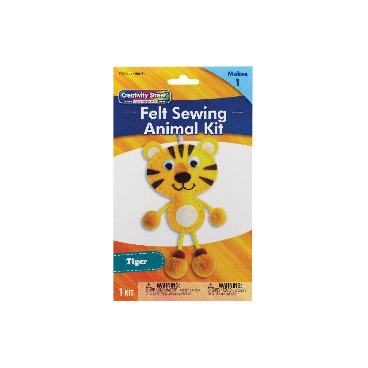 Take a break from screen time with fun and easy Creativity Street® Felt Sewing Animal Kits! This all-in-one solution is the perfect DIY project for kids! The convenient kit includes everything you need to create your very own adorable Tiger: pre-punched felt & felt shapes, stuffing, wiggle eyes, pom pons, ribbon, string and a plastic needle. All you need is glue and scissors, and you can create your new striped friend! Estimated dimensions are 4.25"W x 10.75"L (including string) x 0.75"H/D. Please note, finished product dimensions will vary based on individual assembly.