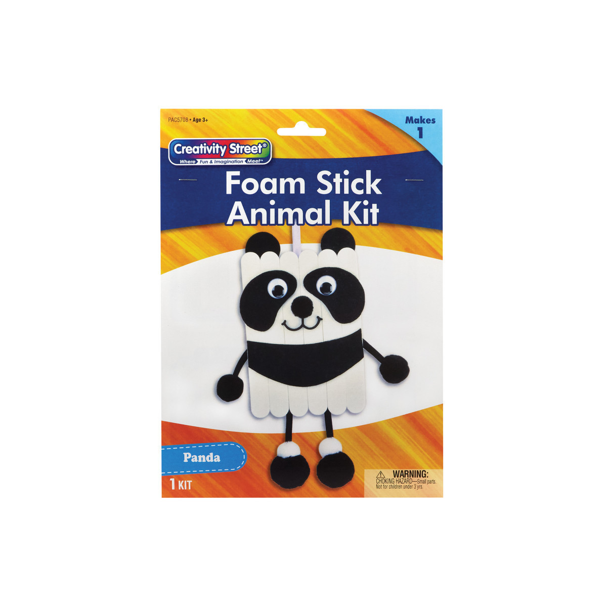 Take a break from screen time with fun and easy Creativity Street® Foam Stick Animal Kits! This all-in-one solution is the perfect DIY project for kids! The convenient kit includes everything you need to create your very own adorable Panda: foam sticks, pre-cut felt shapes, wiggle eyes, pom pons, ribbon and string. All you need is glue and scissors, and you can create a new cuddly friend! Estimated dimensions are 7"W x 11.25"L (including string) x 1"H/D (pom feet). Please note, finished product dimensions will vary based on individual assembly.