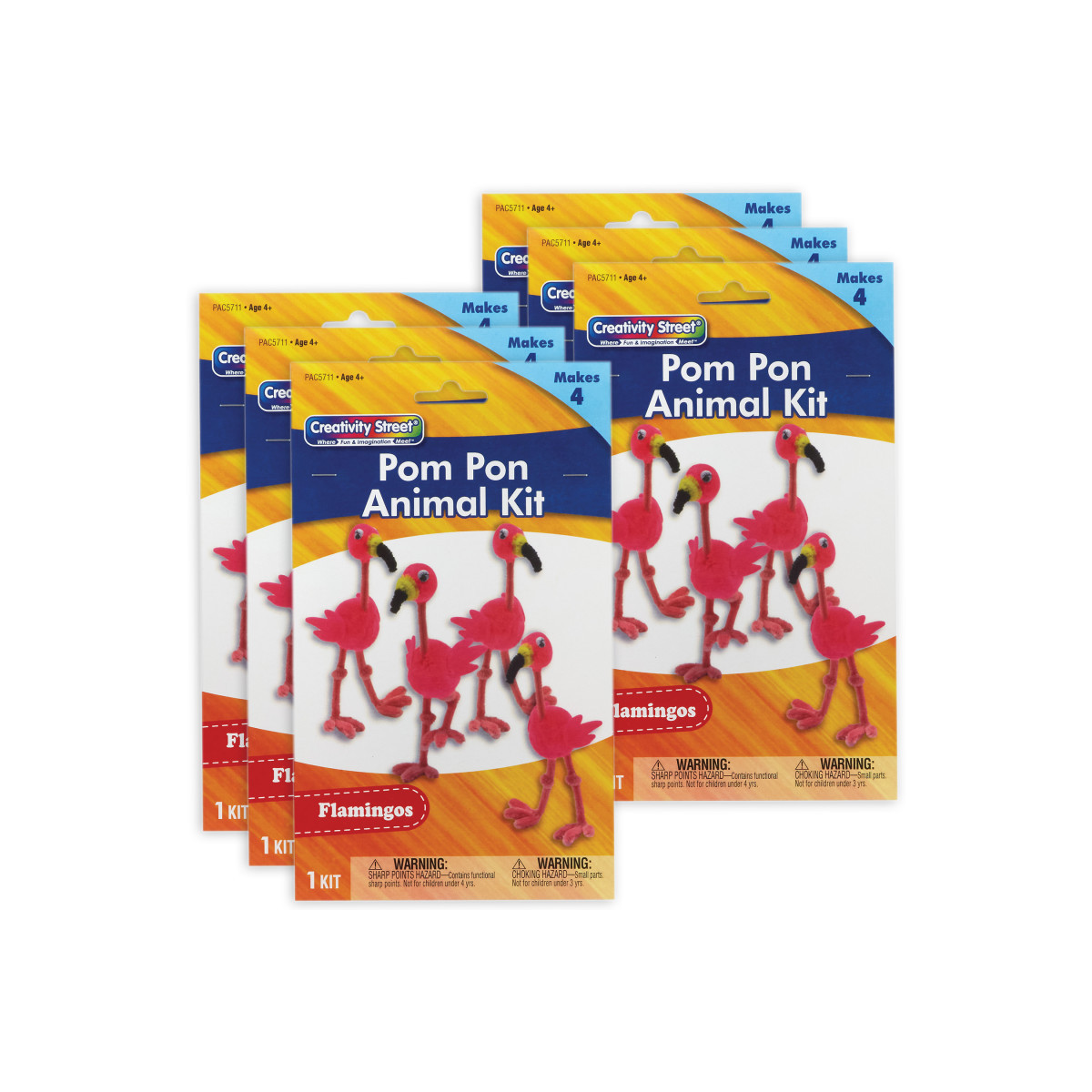 Take a break from screen time with fun and easy Creativity Street® Pom Pon Animal Kits! This all-in-one solution is the perfect DIY project for kids! Each convenient kit includes everything you need to create four adorable Flamingos: pre-cut felt shapes, wiggle eyes, chenille stems and pom pons. All you need is glue and scissors, and you can create your own little flamingo flock! Estimated dimensions are 2"W x 2.75"L x 5.25"H. Please note, finished product dimensions will vary based on individual assembly. Makes 4 flamingos per kit. Sold as 6 kits, 24 flamingos total.