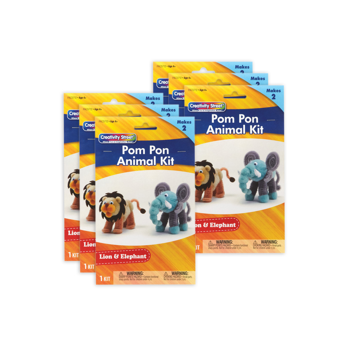 Take a break from screen time with fun and easy Creativity Street® Pom Pon Animal Kits! This all-in-one solution is the perfect DIY project for kids! Each convenient kit includes everything you need to create an adorable Lion and Elephant: pre-cut felt shapes, wiggle eyes, chenille stems and pom pons. All you need is glue and scissors, and you can create your own little African safari animals! Estimated dimensions are as follows: Elephant: 3.75"W x 3.5"L x 3.5"H, Lion: 2"W x 4.25"L x 3"H. Please note, finished product dimensions will vary based on individual assembly. Each kit makes 2 animals. Sold as 6 kits, 12 animals total.