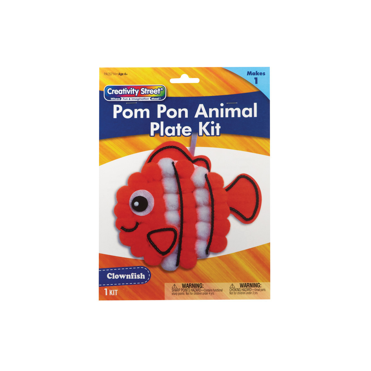 Take a break from screen time with fun and easy Creativity Street® Pom Pon Animal Plate Kits! This all-in-one solution is the perfect DIY project for kids! The convenient kit includes everything you need to create your very own adorable Clownfish: paper plate, pre-cut felt shapes, chenille stems, pom pons and ribbon. All you need is glue and scissors, and you can create your own little Nemo! Estimated dimensions are 7.5"W x 8"L (including string) x 1"H/D. Please note, finished product dimensions will vary based on individual assembly.