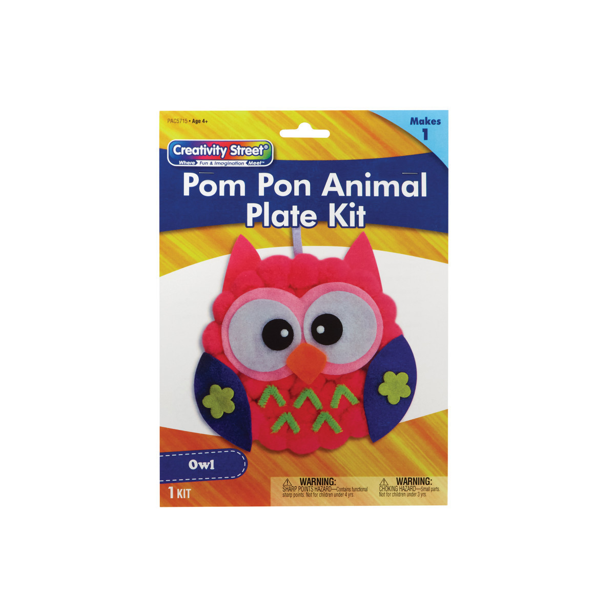 Take a break from screen time with fun and easy Creativity Street® Pom Pon Animal Plate Kits! This all-in-one solution is the perfect DIY project for kids! The convenient kit includes everything you need to create your very own adorable Owl: paper plate, pre-cut felt shapes, chenille stem, pom pons and ribbon. All you need is glue and scissors, and you can create your own wise little friend! Estimated dimensions are 7"W x 8"L (including string) x 1"H/D. Please note, finished product dimensions will vary based on individual assembly.