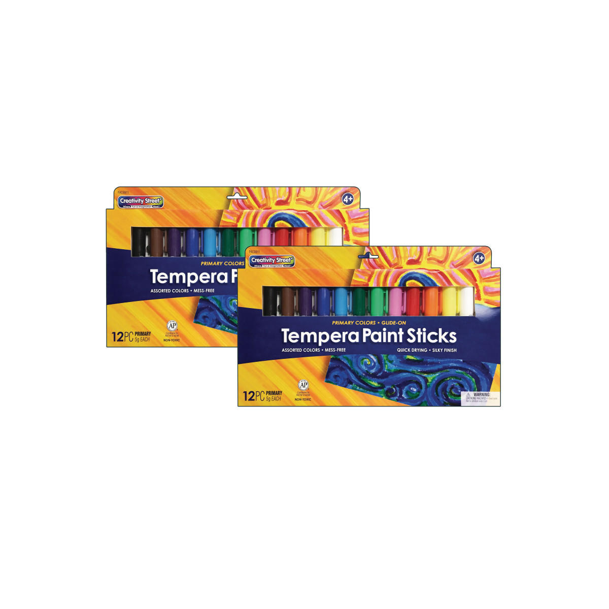 Our Creativity Street® Glide-On Tempera Paint Sticks are fun and easy to use to create beautiful works of art. They glide on surfaces such as paper, chipboard, plastic and much more. These sticks do not bleed through, wrinkle or tear paper. The wide barrels are easy for little hands to control. Twist the bottom of the barrel to push up more paint. Paint directly onto the art surface, or use with a paint brush by adding a little water in a paint pallet or tray. Each stick is 5 grams. Each pack includes 12 sticks: Red, Pink, Orange, Yellow, Dark Green, Light Green, Dark Blue, Light Blue, Purple, White, Brown and Black. Sold as 2 packs for a total of 24 sticks of tempera paint.