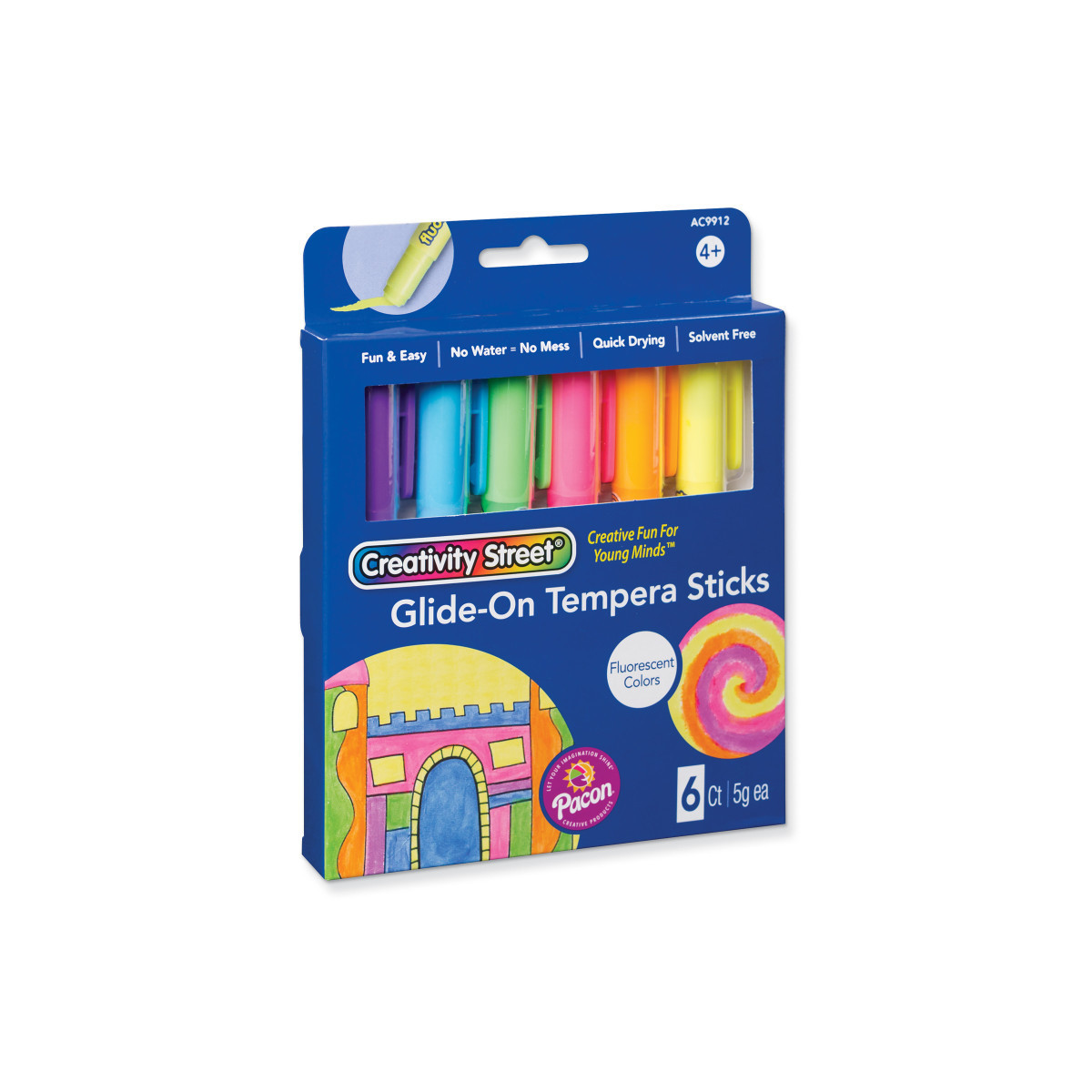 Our Creativity Street® Glide-On Tempera Paint Sticks are fun and easy to use to create beautiful works of art. They glide on surfaces such as paper, chipboard, plastic, and much more. These sticks do not bleed through, wrinkle or tear paper. The Fluorescent Color assortment includes six colors: Fluorescent Pink, Fluorescent Orange, Fluorescent Yellow, Fluorescent Green, Fluorescent Blue, Fluorescent Purple. Each stick is 5 grams. The wide barrels are easy for little hands to control. Twist the bottom of the barrel to push up more paint. Paint directly onto the art surface, or use with a paint brush by adding a little water in a paint pallet or tray.
