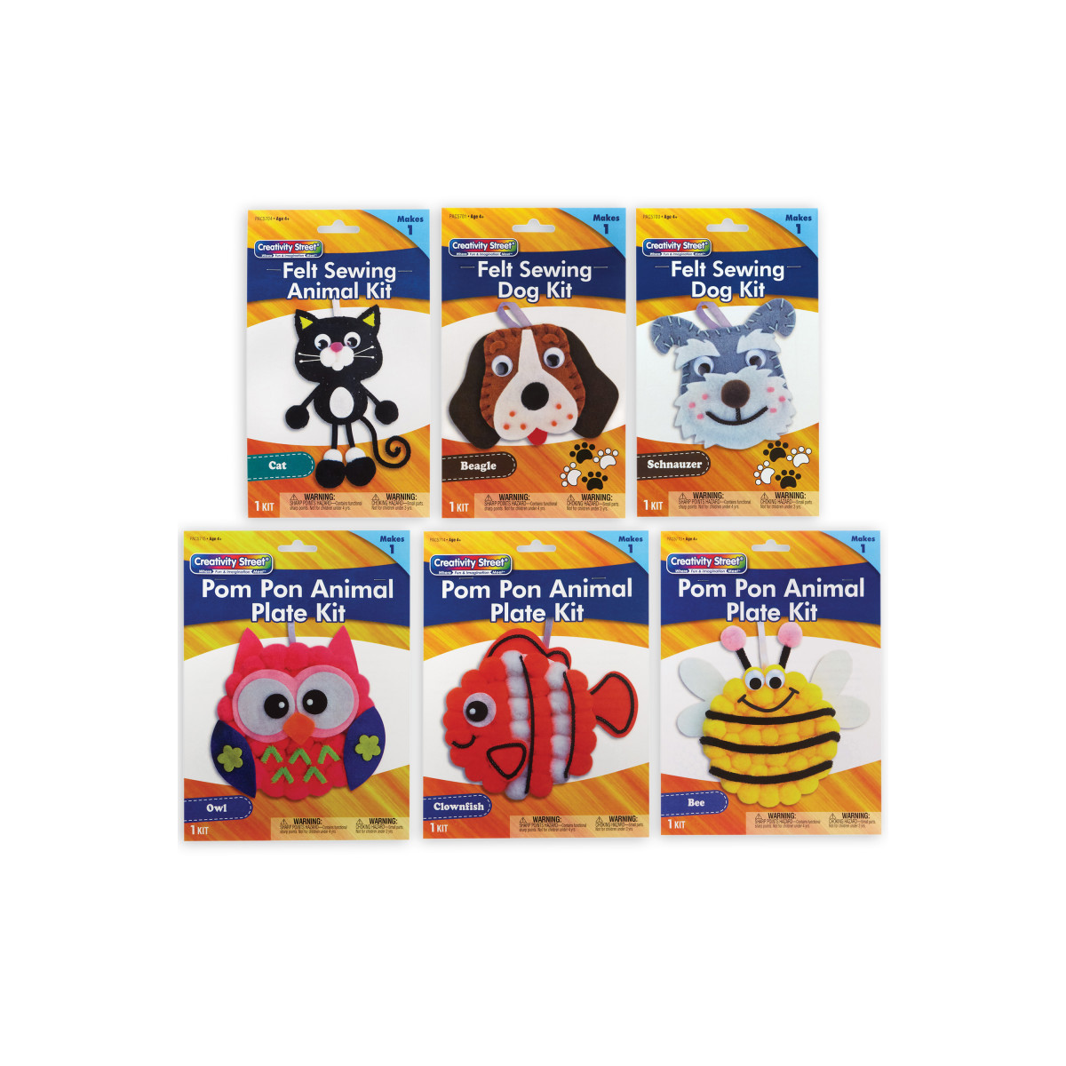 Take a break from screen time with fun and easy Creativity Street® Animal Craft Kits! This all-in-one solution is the perfect DIY project for kids! The convenient kits include everything you need to create your very own adorable animals: pre-punched felt and felt shapes, stuffing, wiggle eyes, whiskers, chenille stems, pom pons, ribbon, string, plastic needles, paper plates and pre-cut foam shapes. All you need is glue and scissors, and you can create your new best friend! This set includes the following 6 kits: Felt Sewing Schnauzer Kit, Felt Sewing Beagle Kit, Felt Sewing Cat Kit, Pom Pon Bee Plate Kit, Pom Pon Clownfish Plate Kit, and Pom Pon Owl Plate Kit. The included kits make a total of 6 animals.
