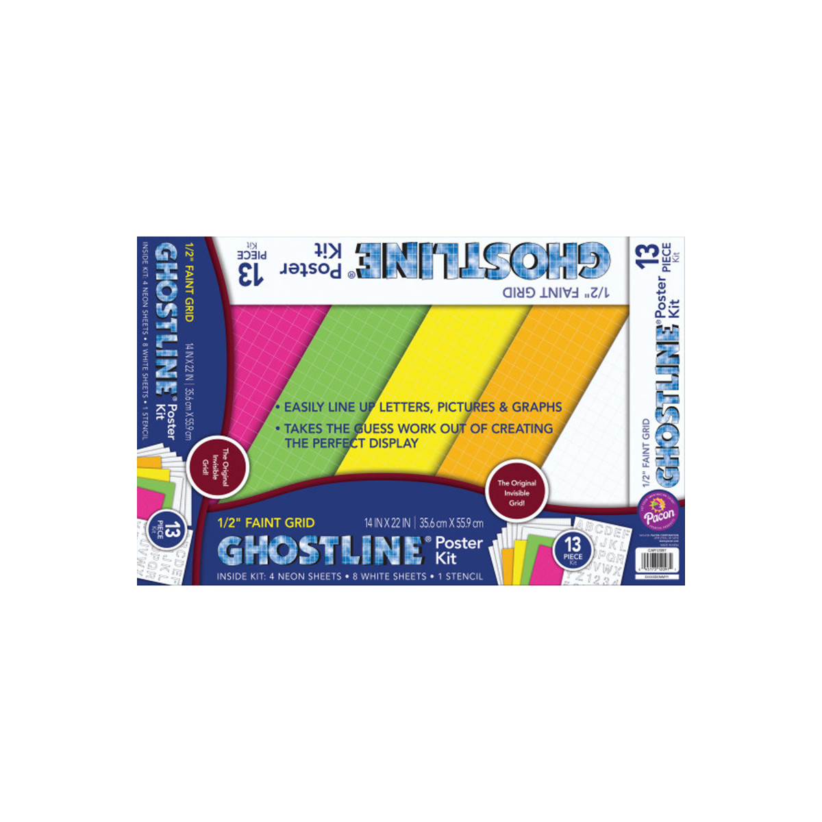 This Ghostline® Poster Board Kit contains everything you need to create professional looking posters, charts or displays. Contents include eight sheets of White poster board, four sheets of neon poster board (Neon Yellow, Neon Orange, Neon Green and Neon Pink), plus a 2" stencil sheet that includes letters, numbers and symbols.