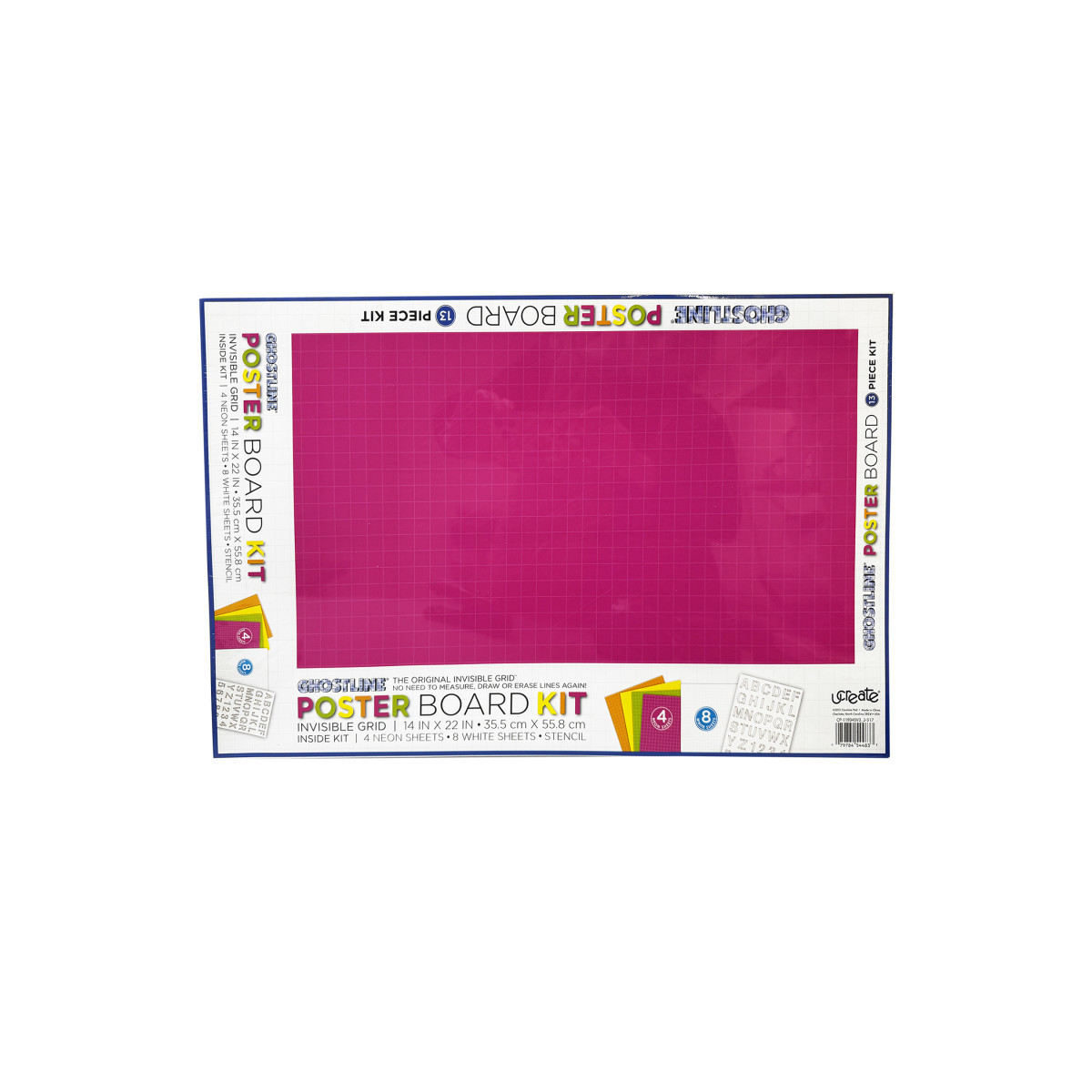 This Ghostline® Poster Board Kit contains everything you need to create professional looking posters, charts or displays. Contents include eight sheets of White poster board, four sheets of neon poster board (Neon Yellow, Neon Orange, Neon Green and Neon Pink), plus a 2" stencil sheet that includes letters, numbers and symbols.