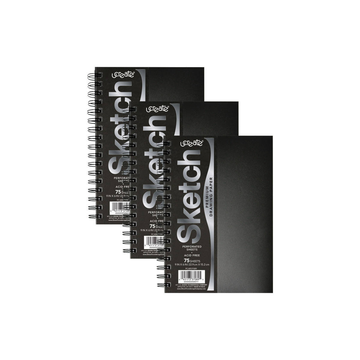Premium sketch book with a durable black poly cover and back. Each book contains 75 sheets of heavyweight, acid-free drawing paper. The spiral binding lies flat for comfortable drawing and sketching. Ideal for sketching and drawing with dry media. Sheets are perforated for final art. Acid-free. Sold as a pack of 3 books.