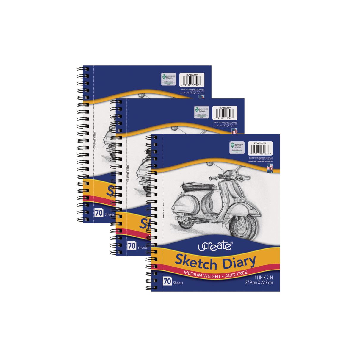 Medium weight sketch diary features bright white paper that is acid-free. Sheets are perforated for final art. Spiral bound on the side. Ideal for dry media. Each diary includes 70 sheets. Sold as a pack of 3 books.