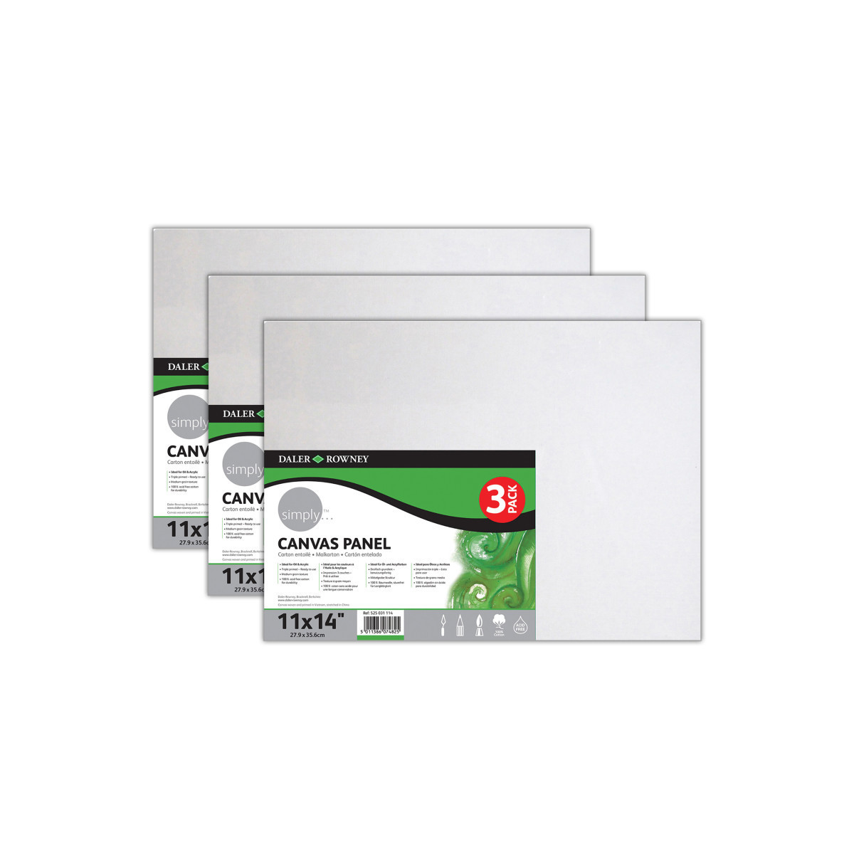 This is a triple primed, medium grain texture, and 100% acid free cotton canvas for durability. The heavy-duty surface holds color and prevents seepage through the back. It is ideal for oil and acrylic painting and suitable for mixed media, collage, impasto, heavy textures, etc. Canvases measure 11" x 14". Each pack includes 3 canvases. Sold as 3 packs for a total of 9 canvases.