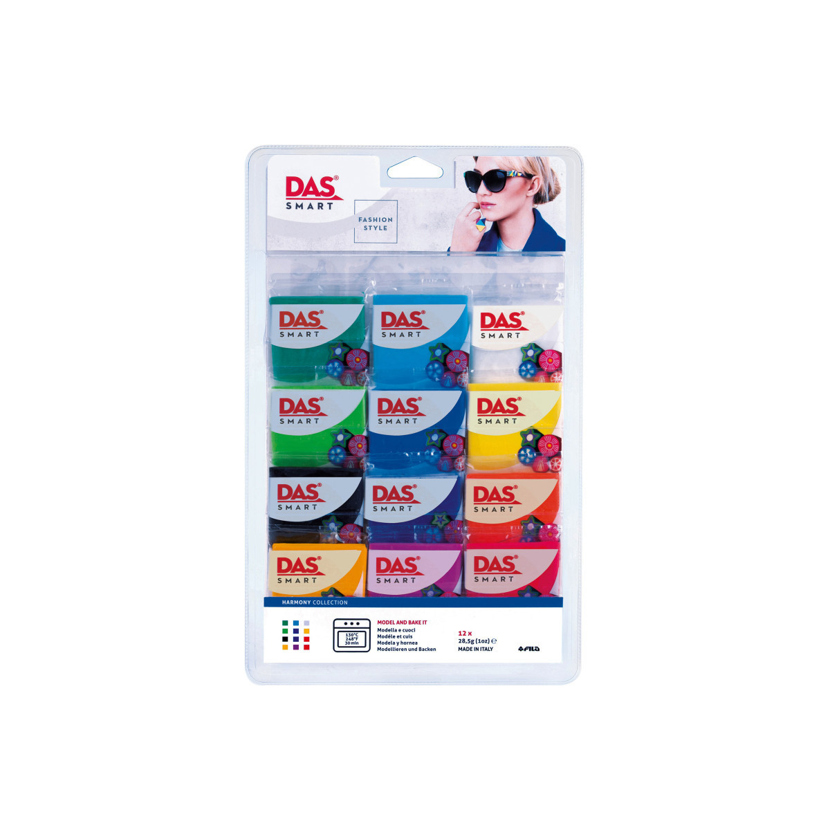 Easy to manipulate, with a compact and versatile structure, DAS Smart is the PVC-based oven-hardening clay that does not stain your hands. It is ideal for making murrine, creating jewels and small artifacts. Bake in a 130° oven for up to 30 minutes, but objects can be cooked several times to add new details. Includes 1 oz. each of Lemon Yellow, Warm Yellow, Orange, Geranium Pink, Violet, Scarlet Red, Apple Green, Emerald, Turquoise, Cobalt Blue, Black, and Opal White.