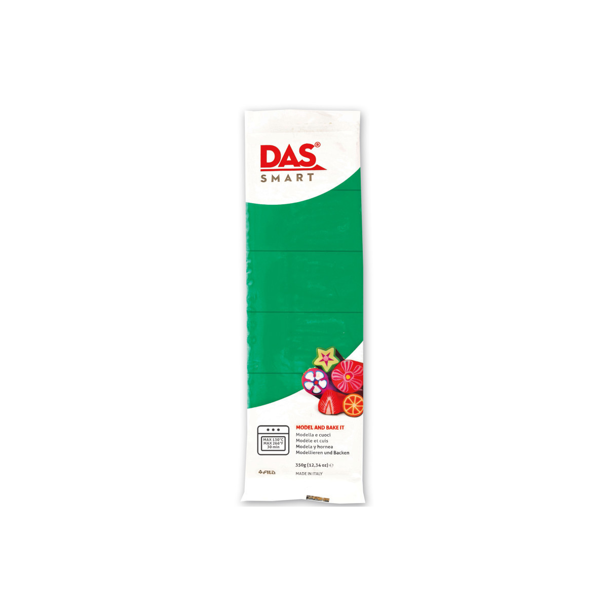 Easy to manipulate, with a compact and versatile structure, DAS Smart is the PVC-based oven-hardening clay that does not stain your hands. It is ideal for making murrine, creating jewels and small artifacts. Bake in a 130° oven for up to 30 minutes, but objects can be cooked several times to add new details. Sold as 1 (350 g) package of Emerald clay.