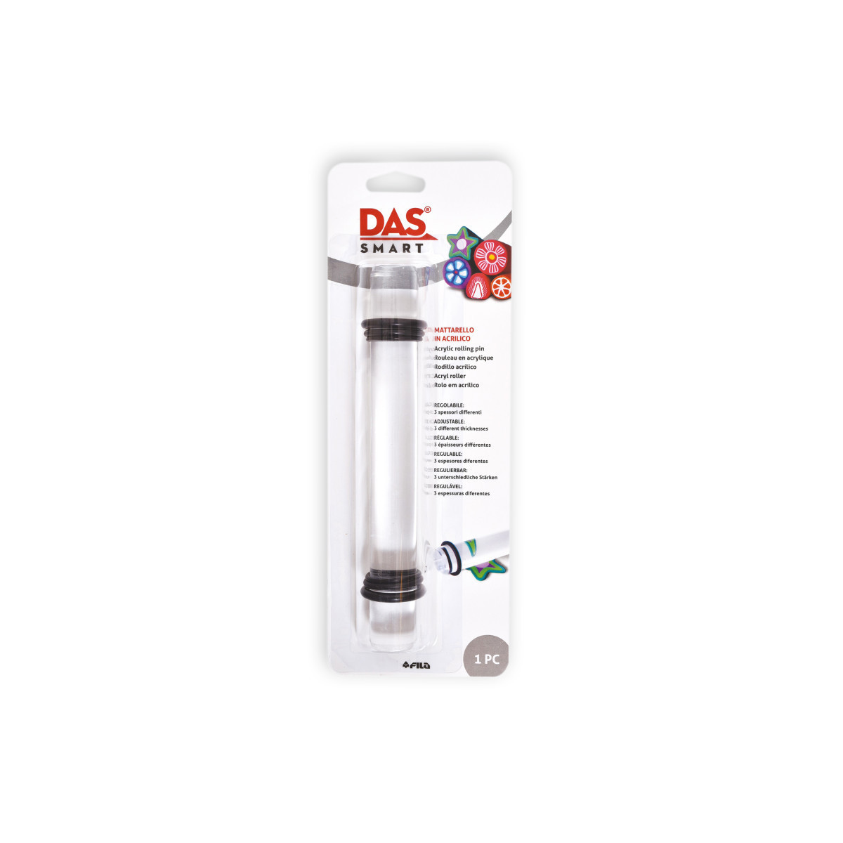 This polycarbonate roller features a lense effect and an anti-slip surface that will not adhere to your materials. The roller pin is adjustable through three pairs of rings that produce different thicknesses (2.5 mm, 3.5 mm and 5 mm). Includes 1 roller.