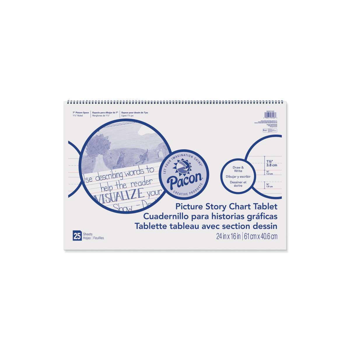 White bond paper spiral bound to stiff covers. This chart tablet is 1.5" ruled with a 0.75" dotted midline and 0.5" skip space and has a 7" picture story area at the top. Recyclable. Measures 24" x 16". Includes 25 sheets.