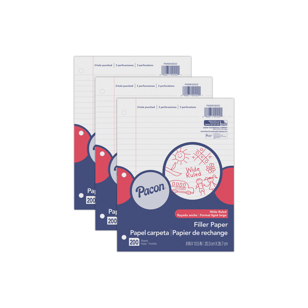 Quality filler paper for all of your home, office and classroom needs. Smooth White paper features 3/8" wide ruling in 8" x 10.5" size. 3-hole punched and ruled on both sides. Recyclable. Each pack includes 200 sheets. Sold as 3 packs for a total of 600 sheets.