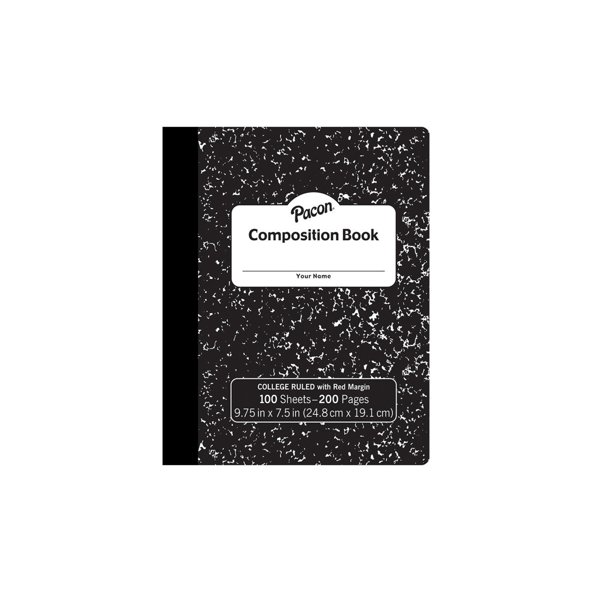 Black marble, hard cover composition book with 100 sheets to meet your needs. Sheets are college ruled (9/32" ruled) and contain a red margin to help keep your notes neat. Great for note taking and journaling. Recyclable.