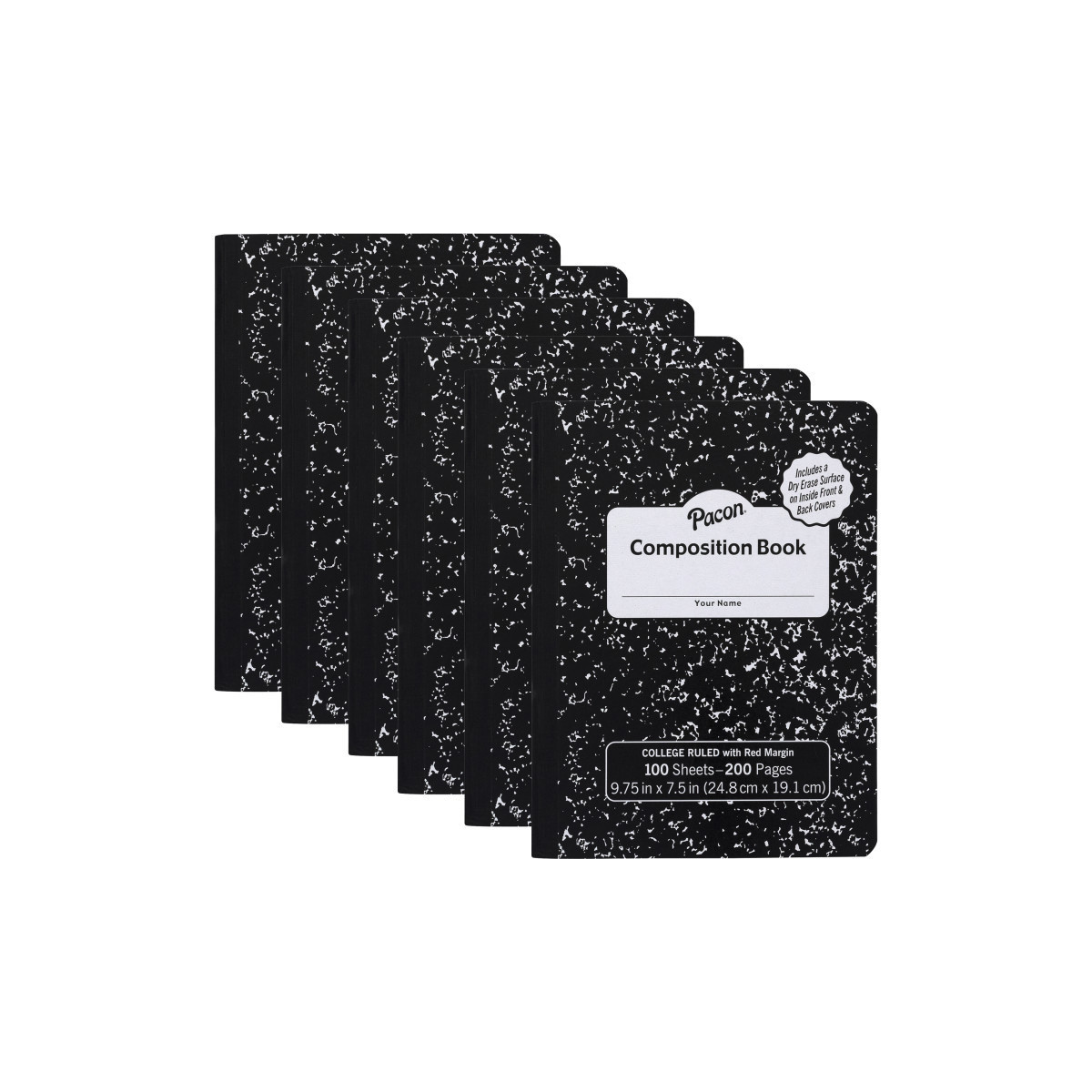 Organize your day, your thoughts, or just practice your lesson using the dry erase surfaces inside these new composition books. Two dry erase surfaces, located inside the front and back covers, provide exciting new ways for your student to learn, engage and have fun. These hard cover books come in black marble, with 100 sheets each. College (9/32") ruled with Red Margins. Recyclable. Sold as a pack of 6 books.