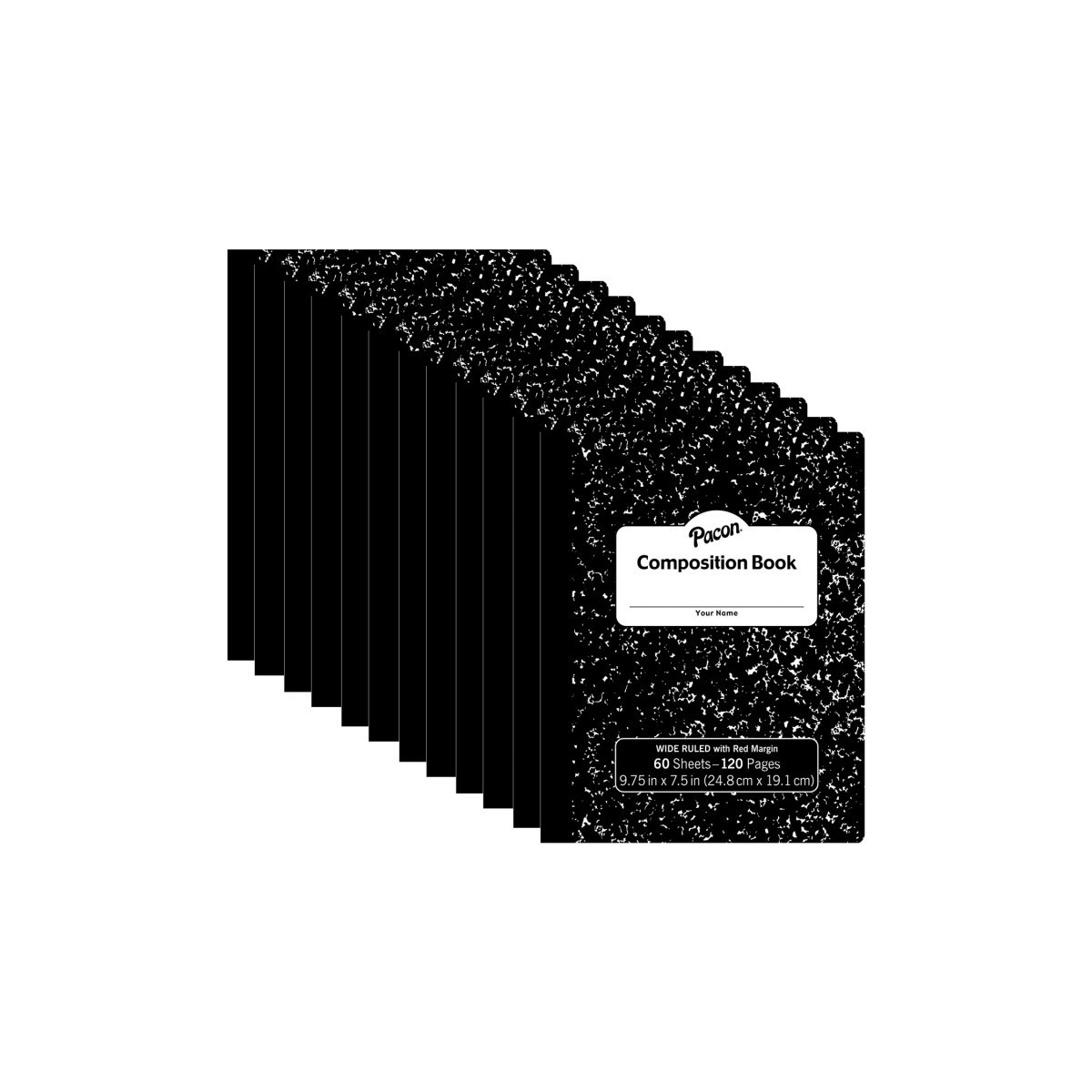 Black marble, hard cover composition book with 60 sheets to meet your needs. Sheets are wide ruled (3/8" ruled) and contain a red margin to help keep your notes neat. Great for note taking and journaling. Recyclable. Measures 9.75" x 7.5". Sold as a pack of 12 books.