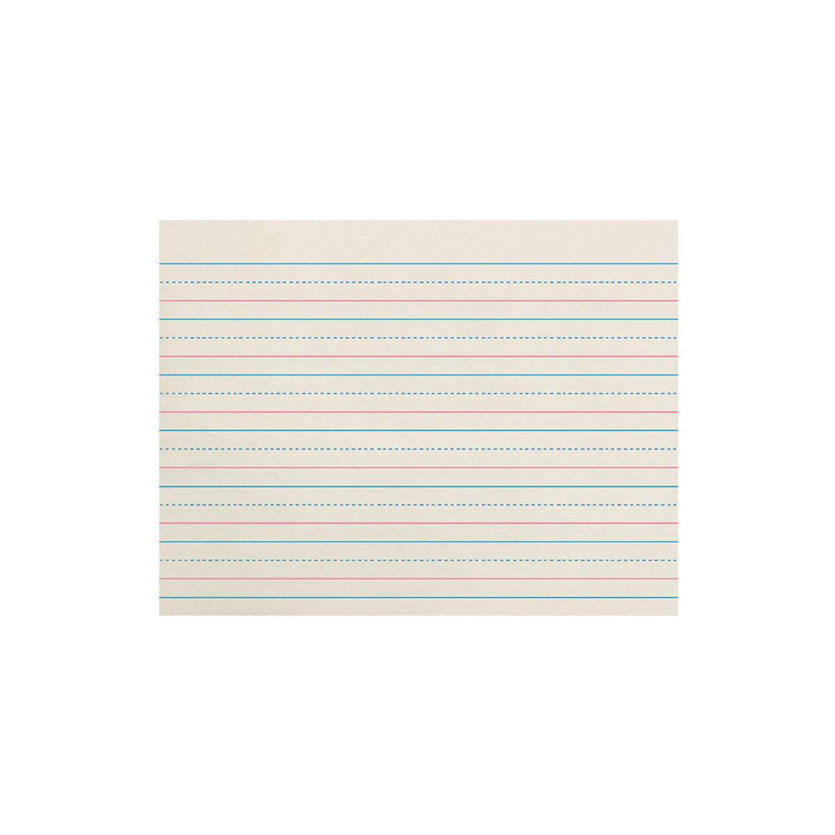 Clean white newsprint that's 3/4" ruled on both sides with 3/8" blue dotted midline, red baseline and 3/8" skip space