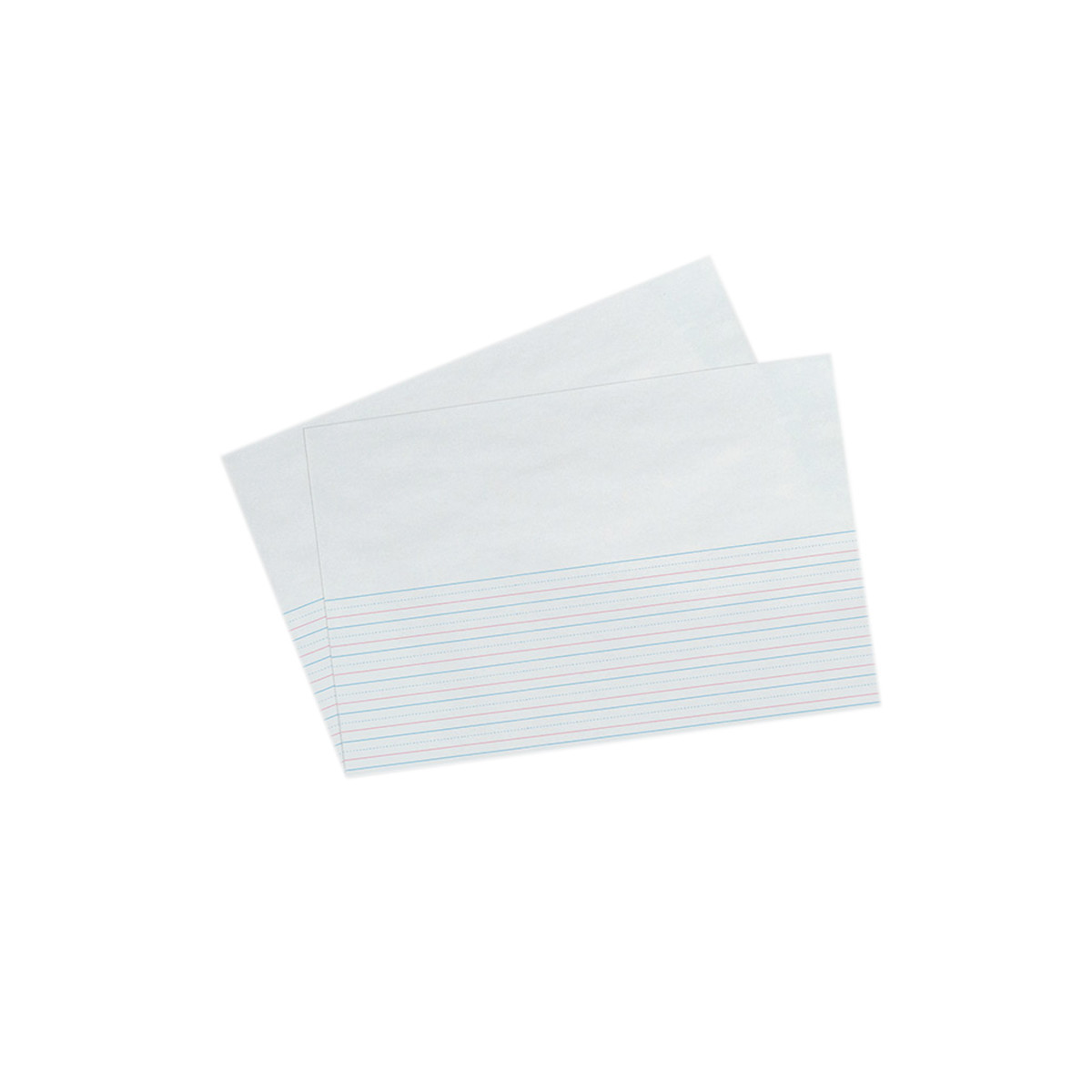 Clean White newsprint printed both sides with 6" blank space at the top of the sheet. Red baseline, dotted blue midline and Skip-A-Line format. Sheets measure 18" x 12". Each pack includes 250 sheets. Recyclable.