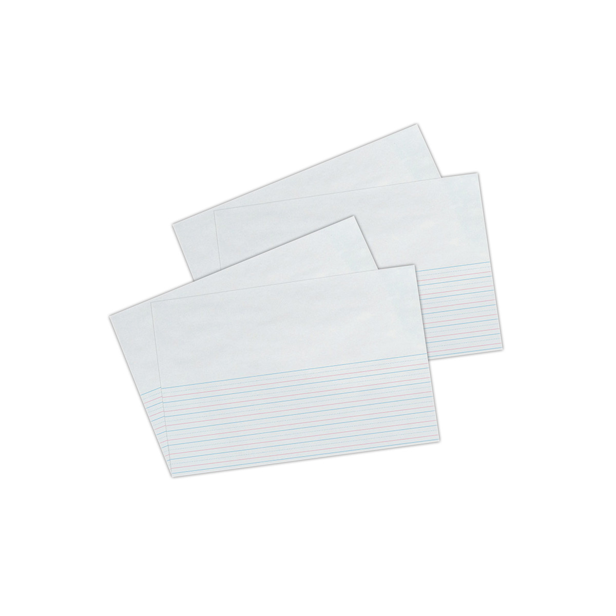 Clean White newsprint printed both sides with 6" blank space at the top of the sheet. Red baseline, dotted blue midline and Skip-A-Line format. Sheets measure 18" x 12". Each pack includes 250 sheets. Recyclable. Sold as 2 packs for a total of 500 sheets.