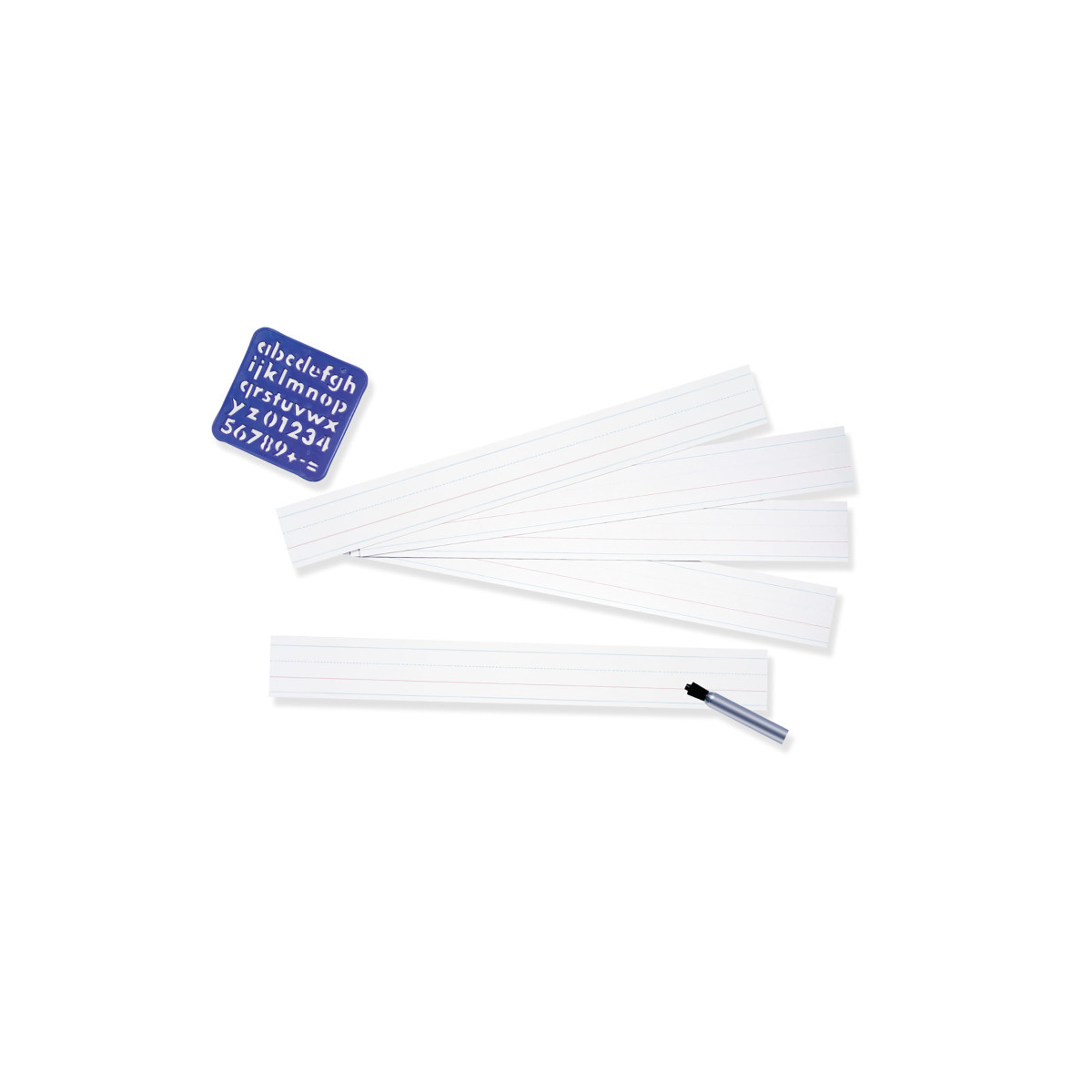 Sturdy, White tagboard in 3" x 24" sentence strips. Ruled 1-1/2" with Red baseline, 3/4" dotted Blue midline and 3/4" skip space. Opposite side is not ruled. Recyclable. Each pack includes 100 sentence strips. Sold as 3 packs for a total of 300 sentence strips.
