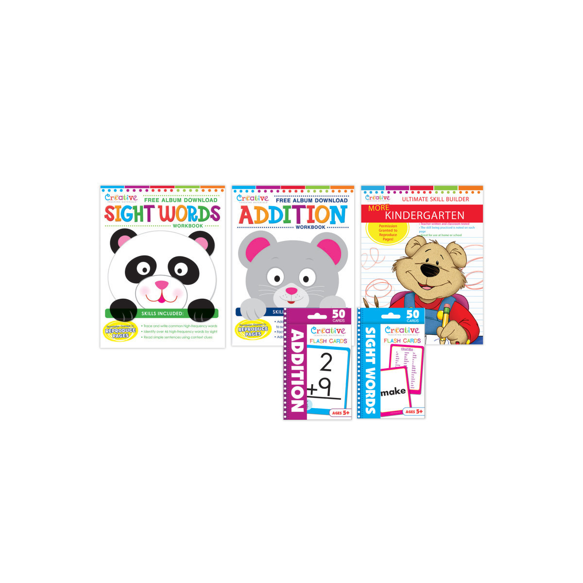 Complete Skill Set – Bundle includes More Kindergarten Ultimate Skill Builder Workbook, Sight Words Workbook, Addition Workbook, Sight Words Flashcards, and Addition Flashcards.
