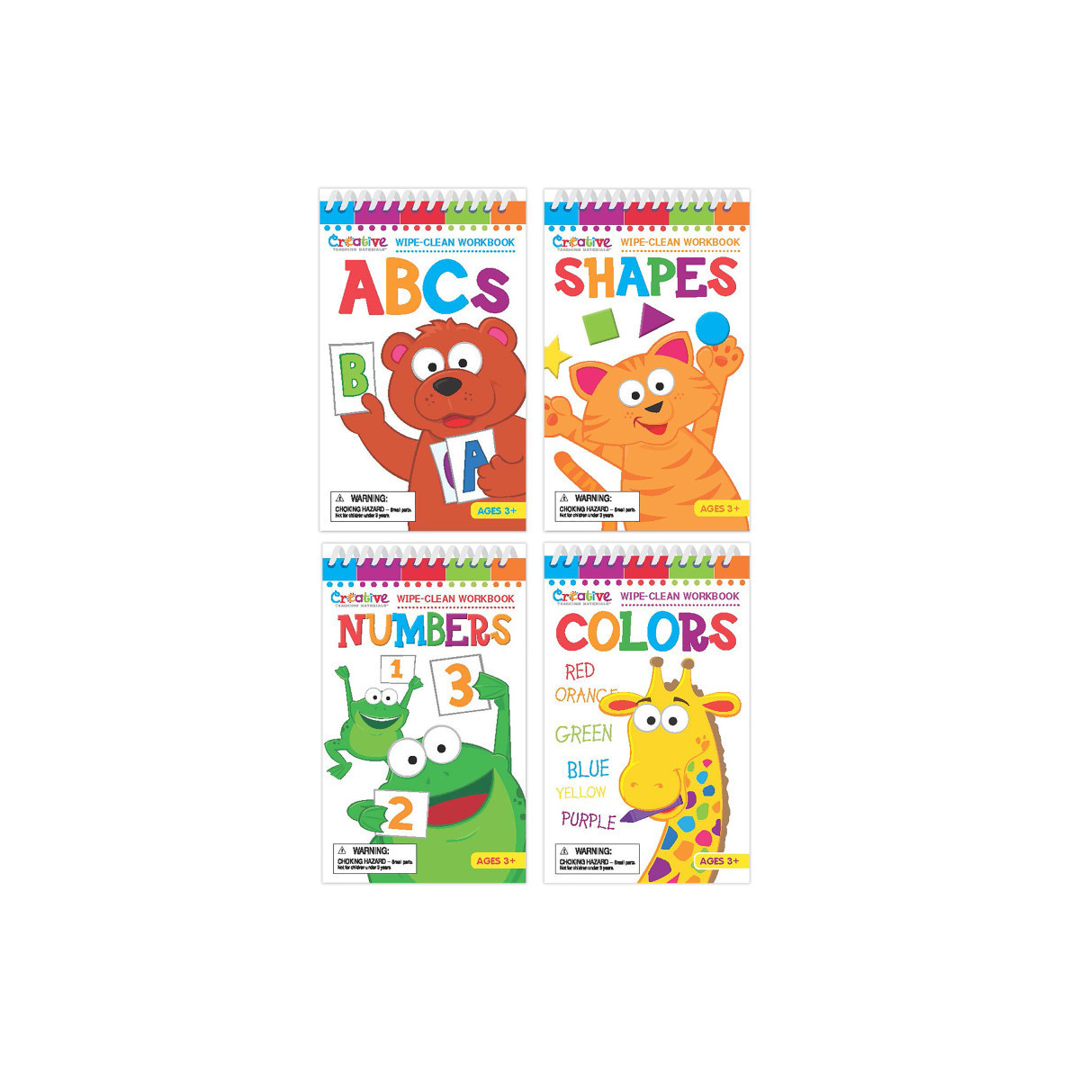 This set of four wipe-clean books offers an engaging and reusable way for young learners to build foundational skills in shapes, numbers, the alphabet, and colors. Each compact 4.25" x 7" book includes 22 sturdy, laminate pages and a dry-erase marker, making practice easy, mess-free, and perfect for home, school, or travel. From tracing shapes and numbers to practicing letters and color words, these books provide hours of hands-on learning while reinforcing fine motor skills. The durable wipe-clean pages allow for endless practice, helping children grow confident in early learning essentials.