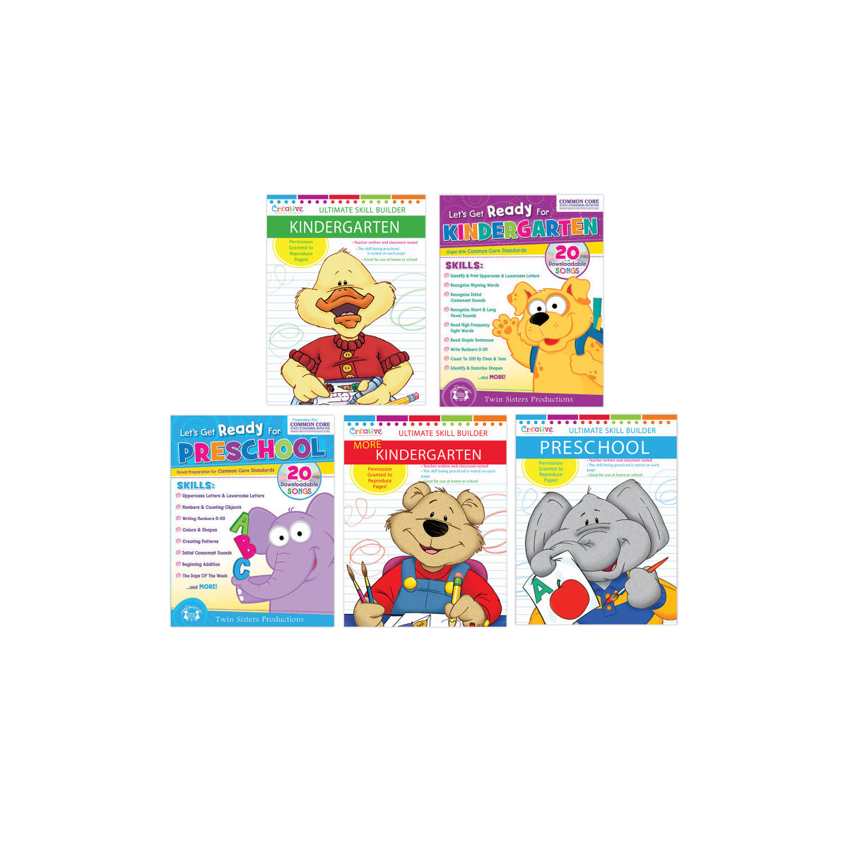 Individual book information: Preschool Ultimate Skill Builders Workbook: This workbook supports readiness for school-level work and covers a complete range of academic skills including: numbers, shapes & sizes, letters, letter sounds, classifying objects, tracing, writing, rhyming words, and more! Ages 3+ Each book includes 320 black and white pages with Answer key provided. Permission granted to reproduce pages. The skill being practiced noted on each page. Teacher written and classroom tested. Books measure 8.375" x 10.875". Kindergarten Ultimate Skill Builders Workbook: This workbook supports readiness for school-level work and covers a complete range of academic skills including: shapes & sizes, patterns, money, telling time, phonics, alphabetic order, tracing, writing, story sequence, and more! Ages 4+ Each book includes 320 black and white pages with Answer key provided. Permission granted to reproduce pages. The skill being practiced noted on each page. Teacher written and classroom tested. Books measure 8.375" x 10.875". More Kindergarten Ultimate Skill Builders Workbook: This workbook supports readiness for school-level work and covers a complete range of academic skills including: beginning addition, patterns, initial consonant sounds, short and long vowel sounds, tracing, writing, reading words, and more! Ages 5+ Each book includes 320 black and white pages with Answer key provided. Permission granted to reproduce pages. The skill being practiced noted on each page. Teacher written and classroom tested. Books measure 8.375" x 10.875". Let's Get Ready for Preschool Workbook: Let's Get Ready for Preschool includes 256 full color reproducible pages. Skills learned include: uppercase letters & lowercase letter, numbers and counting objects, writing numbers 0-20, colors and shapes, creating patterns, initial consonant sounds, beginning addition, days of the week and much more.